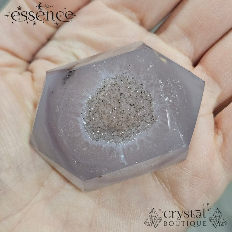 Agate forms inside ancient volcanic cavities, where mineral-rich water slowly builds layer upon layer of chalcedony. Tiny pockets inside remain hollow and grow microcrystalline quartz, creating the druzy sparkle in each piece. The lilac colouring comes from trace minerals captured during formation, giving every piece a soft and soothing glow.