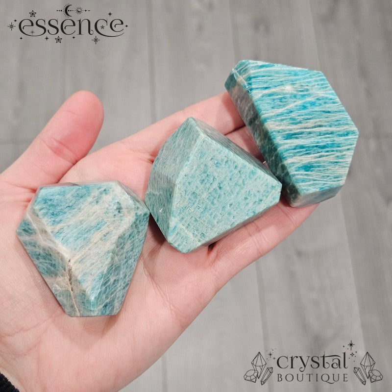 These beautifully hand-polished Amazonite freeforms are full of soft ocean blues, gentle sea-foam greens and natural creamy veining. Each piece has its own personality — from calm, misty washes of colour to striking linear patterns that look like ripples across water.