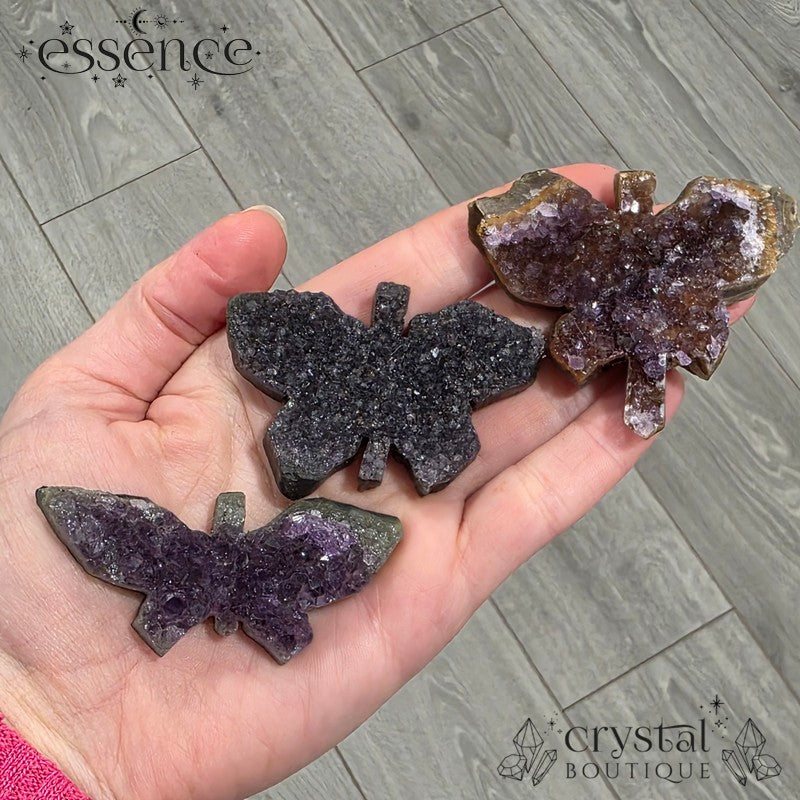 Amethyst is a variety of quartz formed in volcanic rock, where mineral-rich fluids cool and crystalise inside hollow pockets—creating those beautiful druzy clusters we all love. These butterflies keep the natural texture and sparkle intact, with a hand-carved silhouette added to highlight their beauty.
