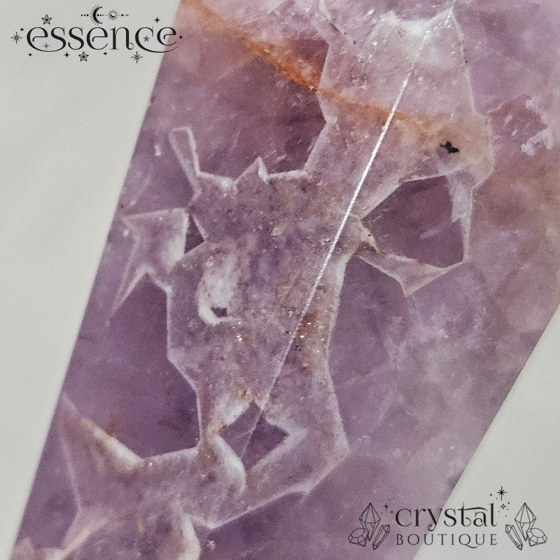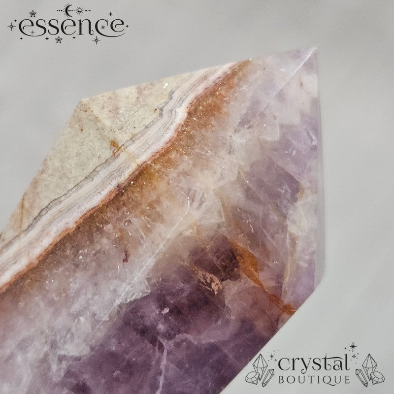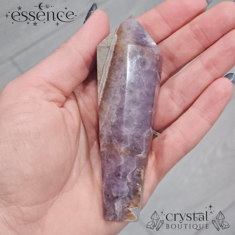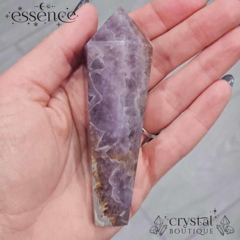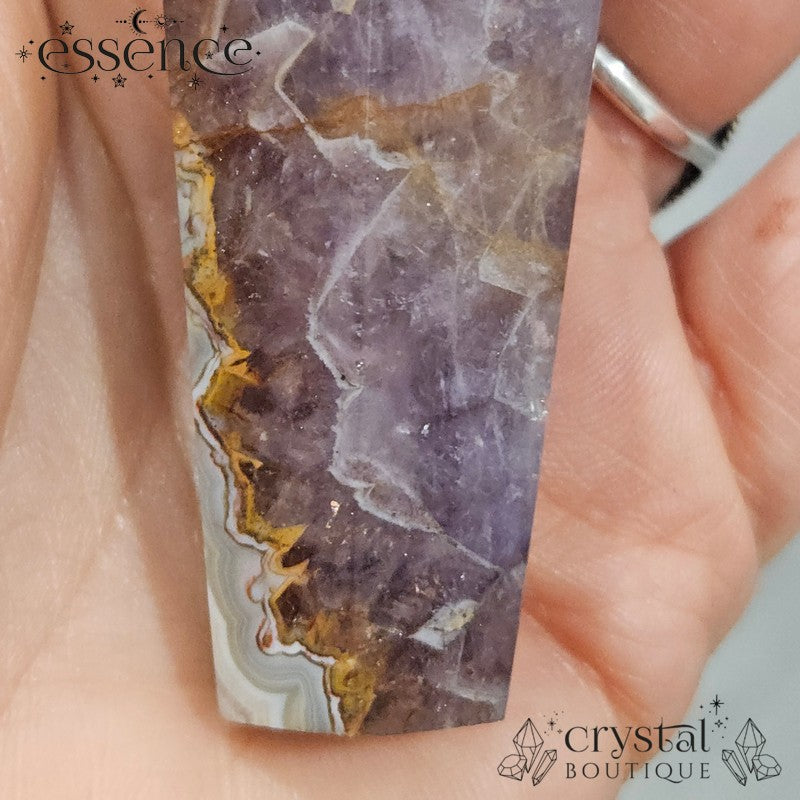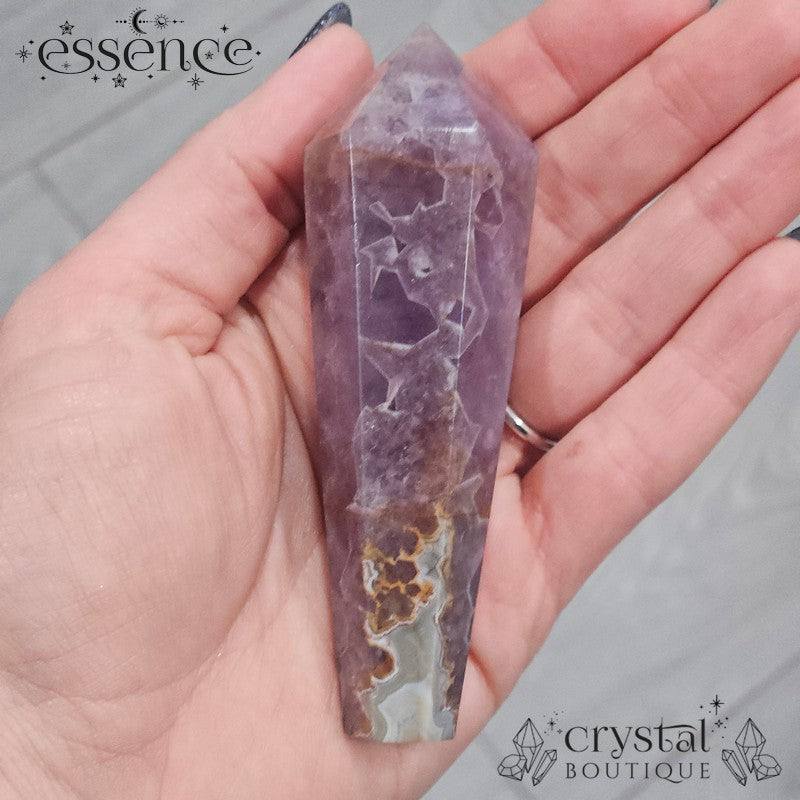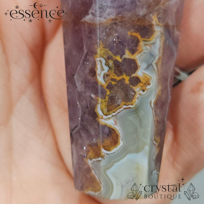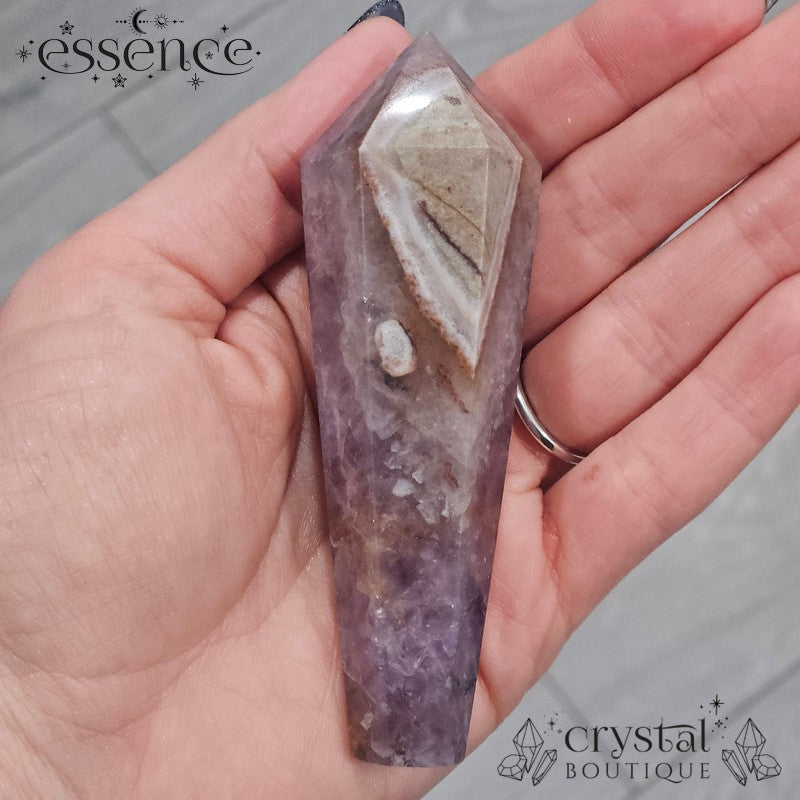 Formed over millions of years, this fusion of crystal and agate showcases nature’s artistry — banded patterns, soft purples, and calming quartz textures, all in one elegant wand.