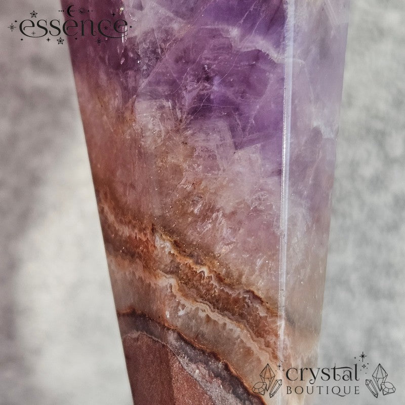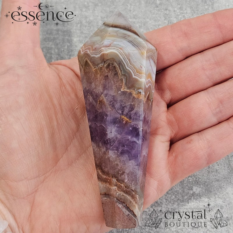 This striking tower brings together the soothing energy of Amethyst with the lively, earthy patterns of Crazy Lace Agate. Weighing 130 grams, it's a solid piece with an eye-catching presence—perfect for display, meditation, or as a standout in your crystal collection.