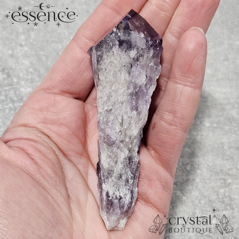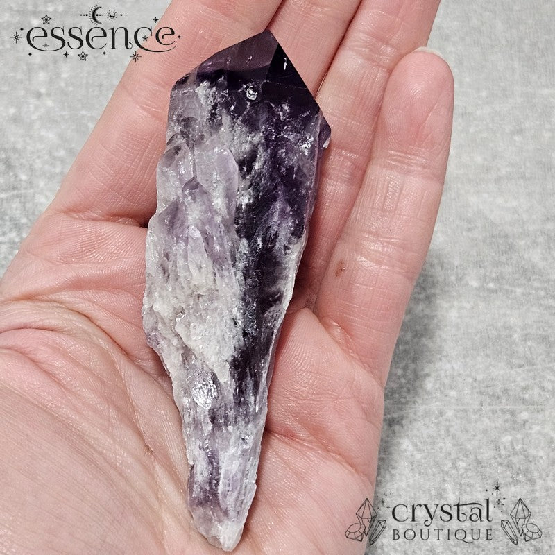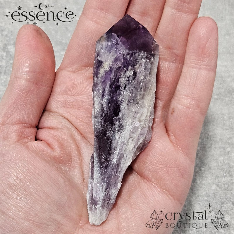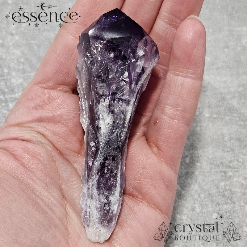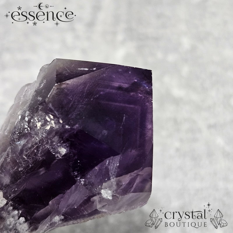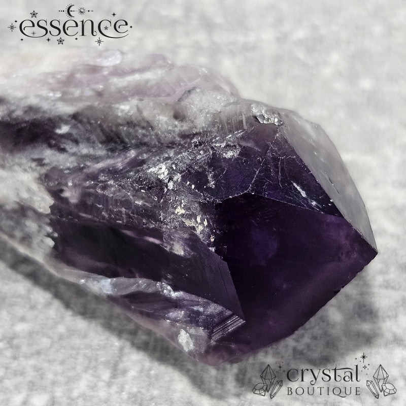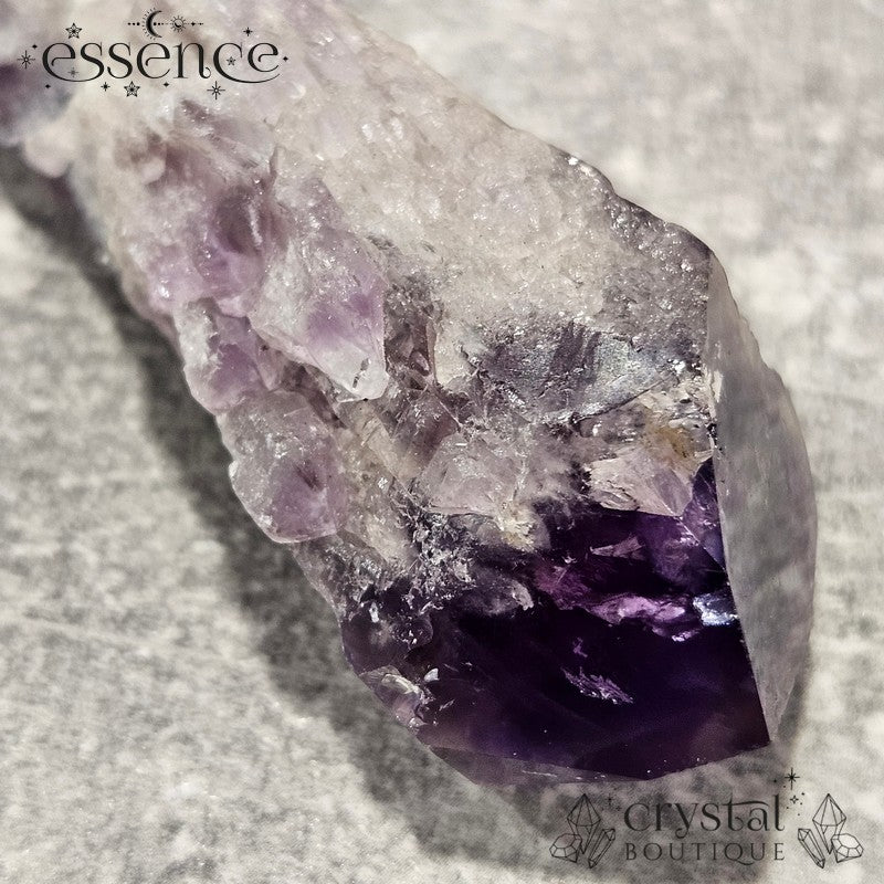 This stunning Amethyst "wand" showcases a rich, deep purple hue with gorgeous natural textures. What makes this piece extra special is the phantom pattern visible in the tip—a fascinating formation that captures layers of the crystal's growth over time.