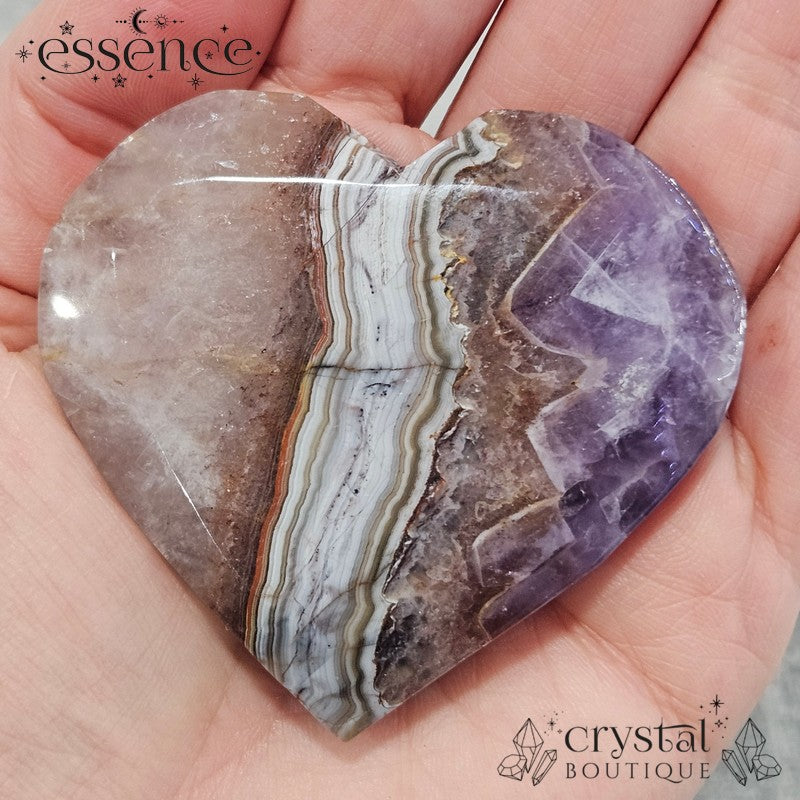Amethyst forms inside volcanic rock cavities, slowly crystallising into those familiar purple shades and geometric patterns. Crazy Lace Agate forms in rhythmic layers as silica-rich fluids settle and harden, creating its signature flowing bands. Together, they make hearts that feel comforting, grounding, and full of character.