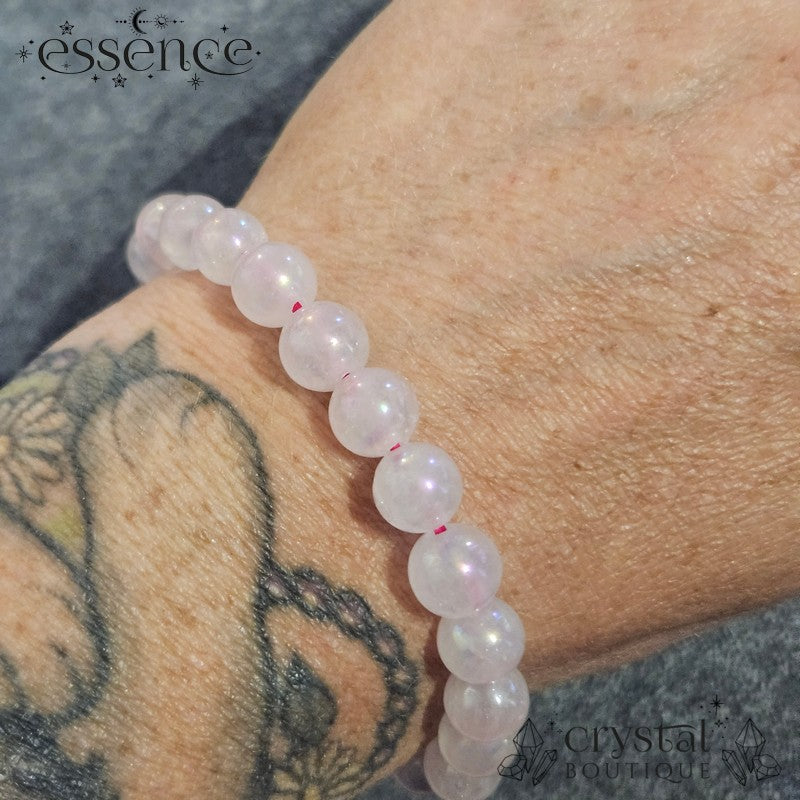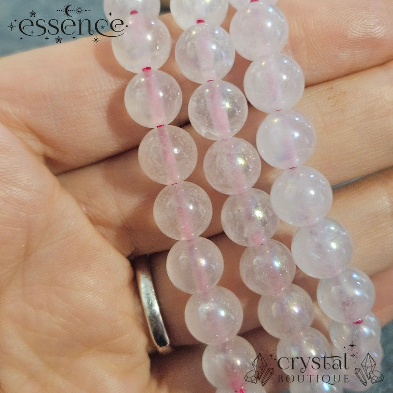 Fall head over heels for this dreamy Aura Rose Quartz bracelet, where soft pink meets rainbow shimmer! Each bead is a natural Rose Quartz—known as the stone of unconditional love—treated with a fine layer of platinum or silver through a magical process called aura bonding. The result? A crystal that glows with iridescent light and amplifies loving energy even more!