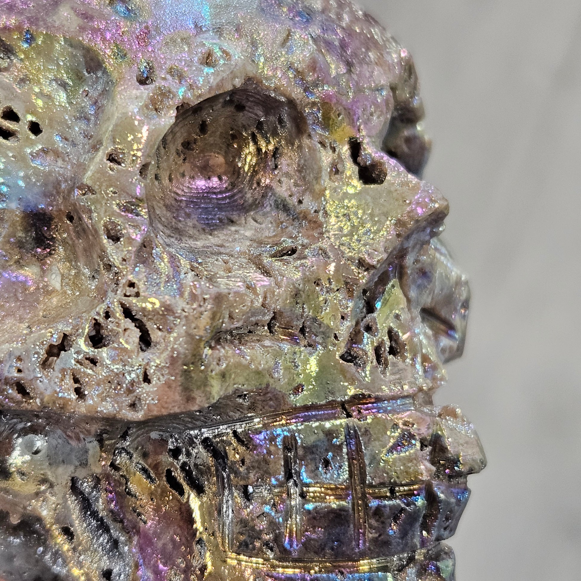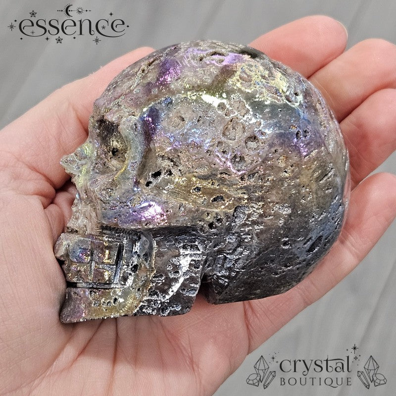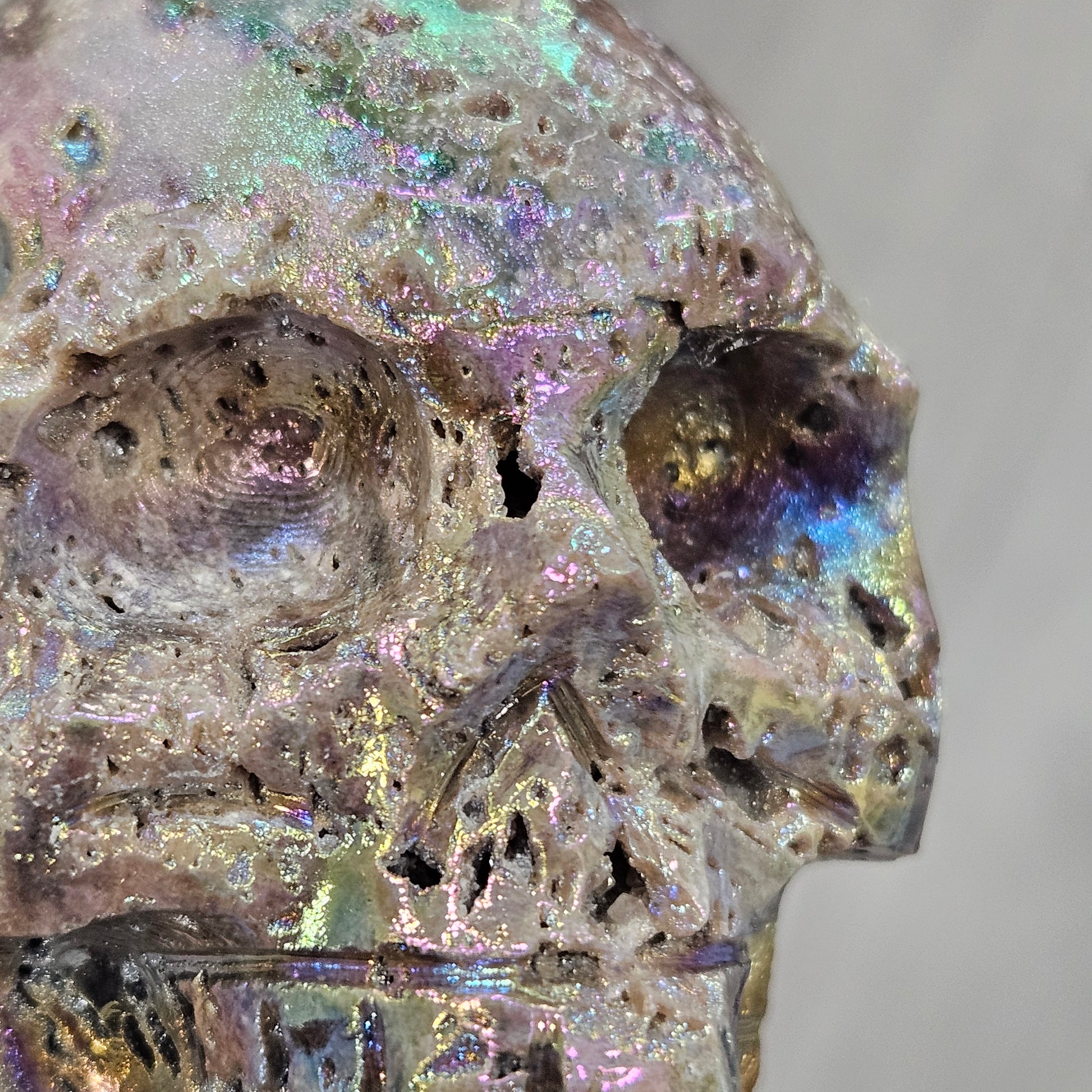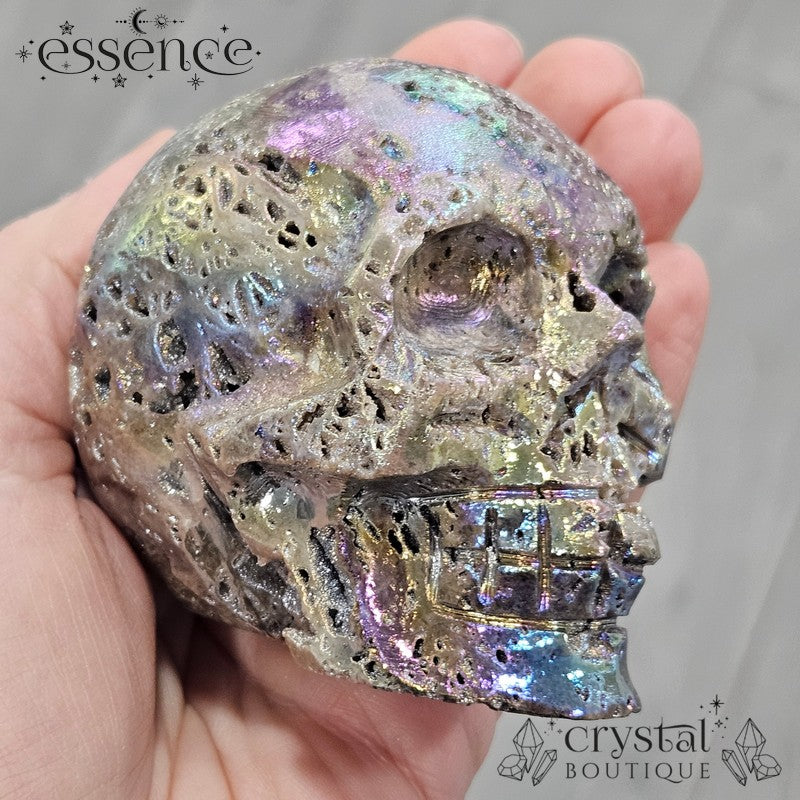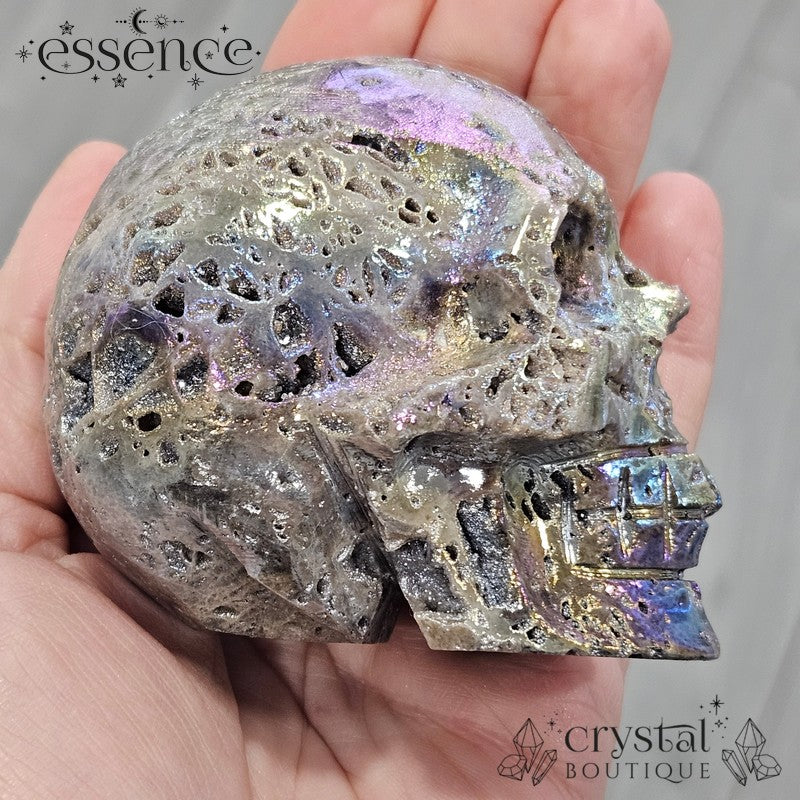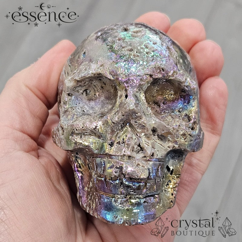 This stunning Aura Sphalerite skull weighs 333g and features mesmerizing iridescent hues of rainbow-like colours. Sphalerite is known for its grounding properties, while the aura finish enhances its natural energy, creating a unique and beautiful focal point for any collection. The skull shape adds an extra layer of symbolism, making it an ideal piece for those who appreciate both aesthetics and spiritual significance.