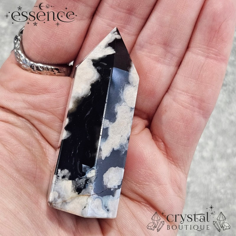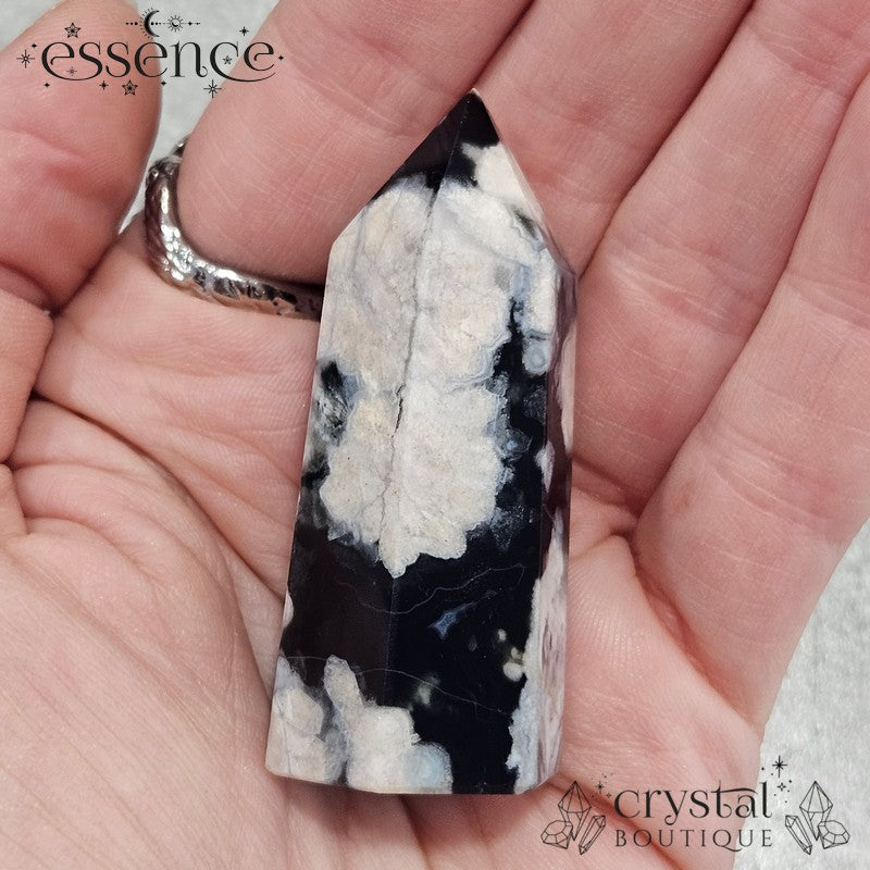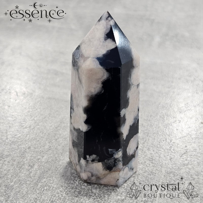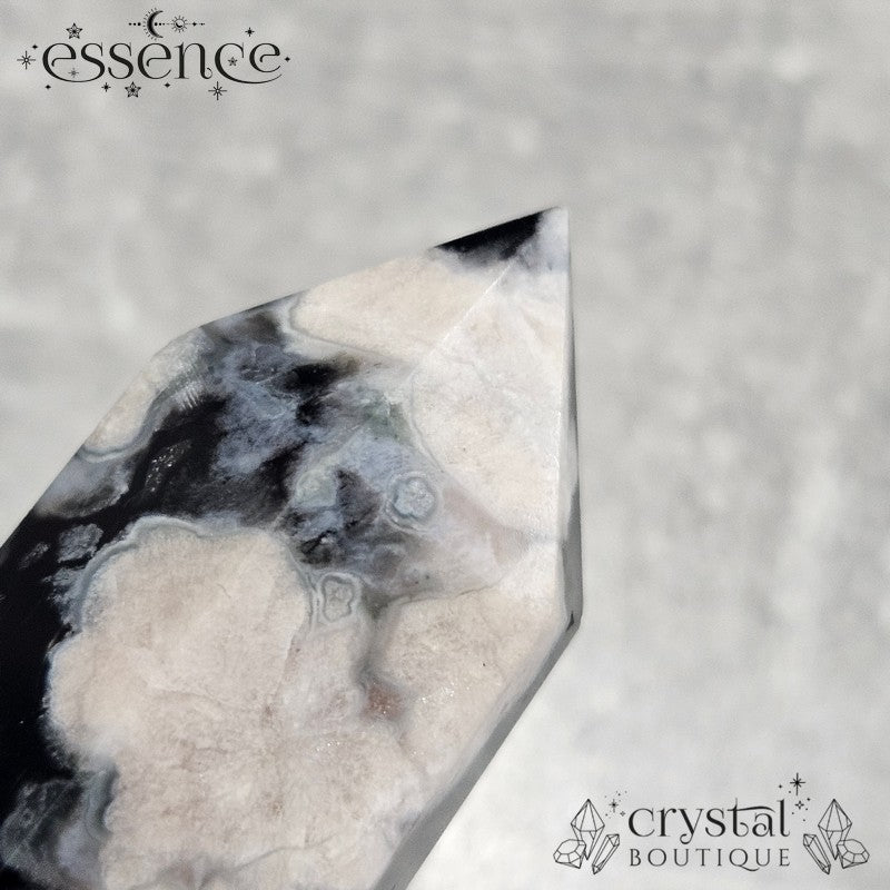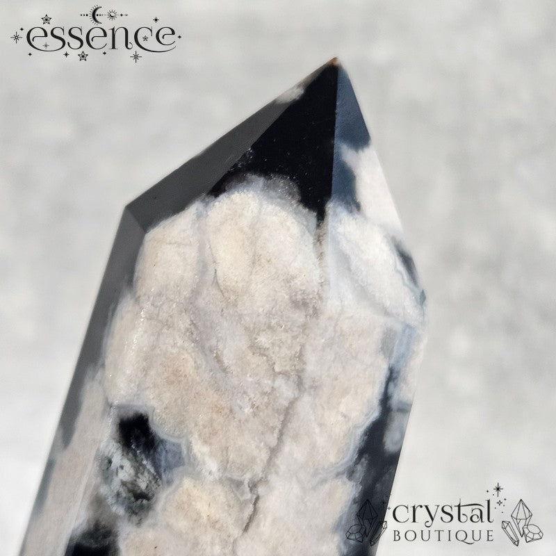 Feel the gentle yet potent vibrations of this majestic Black Flower Agate tower as it harmonizes your spirit and envelops you in serenity. Known for its ability to soothe the soul and promote inner peace, it's the perfect companion for meditation and reflection.