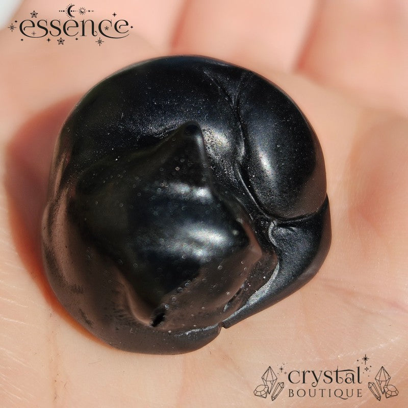 This carved Black Obsidian cat is as smooth and glossy as midnight. Curled up in peaceful slumber, it holds a quiet intensity—like a little sentinel resting between realms. Deep black with a subtle glassy sheen, this feline brings powerful protection and grounding wherever it goes.