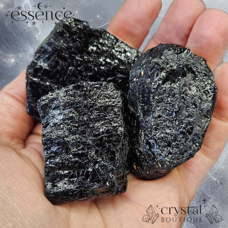 Black tourmaline is a powerful crystal known for its protective and grounding properties. It is a form of tourmaline mineral, typically found in black or dark shades, and it is revered in crystal healing for its ability to repel negative energies and promote a sense of safety and stability. Here's how you can use raw chunks of black tourmaline: