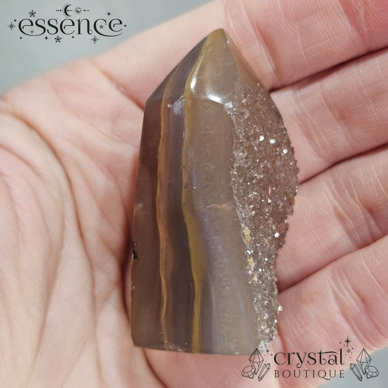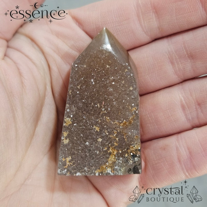These petite Druzy Agate towers are little pockets of earthy enchantment — each one with its own natural sparkle, warm caramel tones, and unique druzy gateway that looks like it was carved by stardust. Perfect for adding a soft shimmer to your altar, desk, or mini crystal grid.