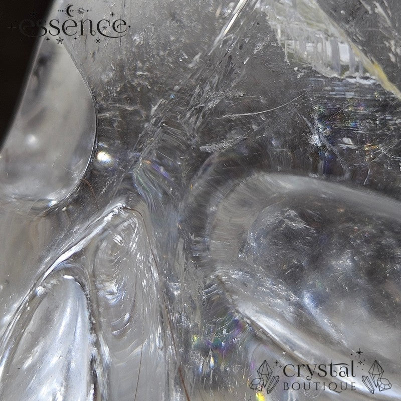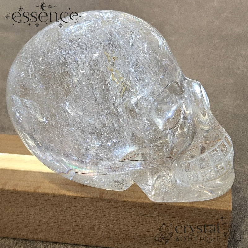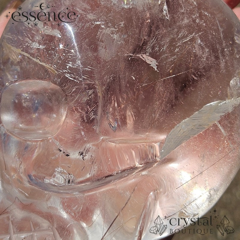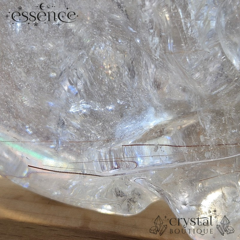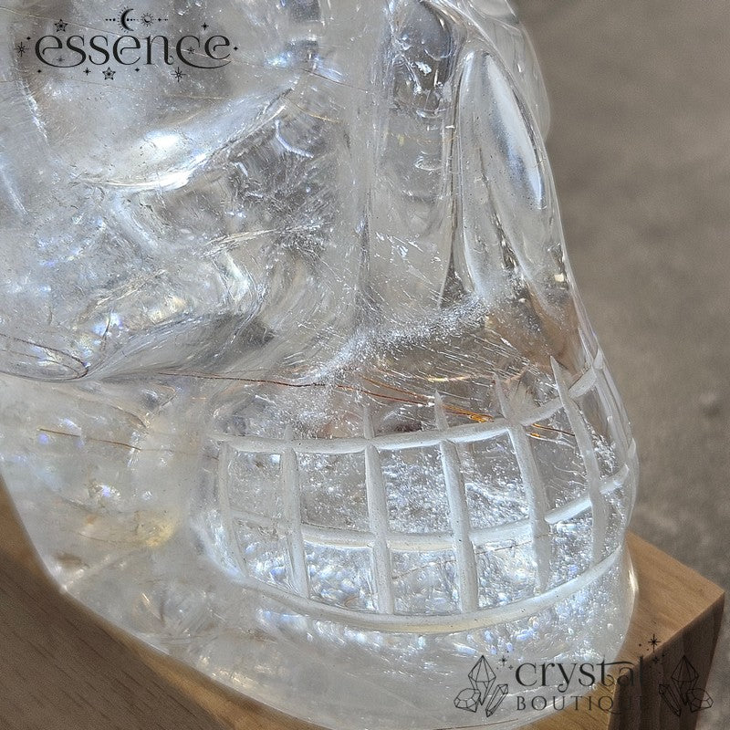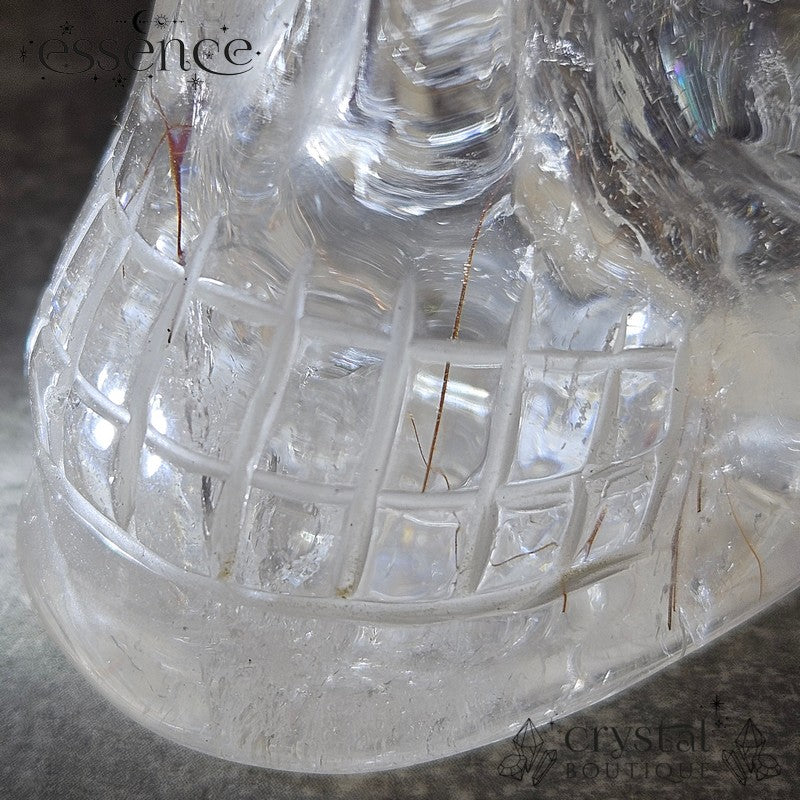 Hand carved in Minas Gerais by master carver Pitico, this 719g crystal skull pairs expert craftsmanship with nature’s own artistry. Clear Brazilian quartz is threaded with fine golden rutile needles and warm iron inclusions, each capturing the light in intricate, natural patterns.