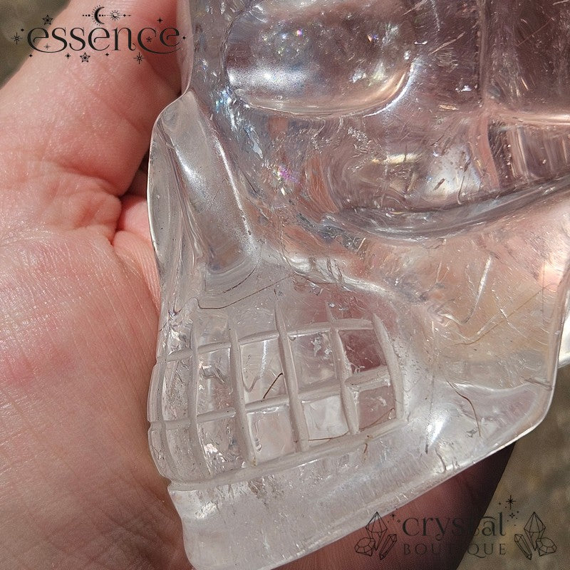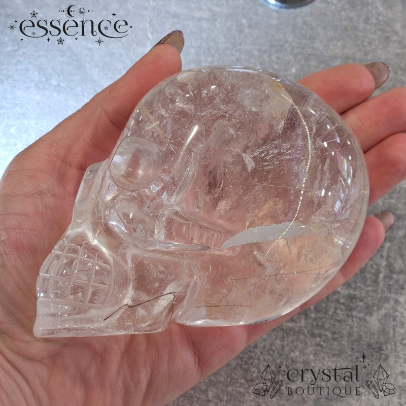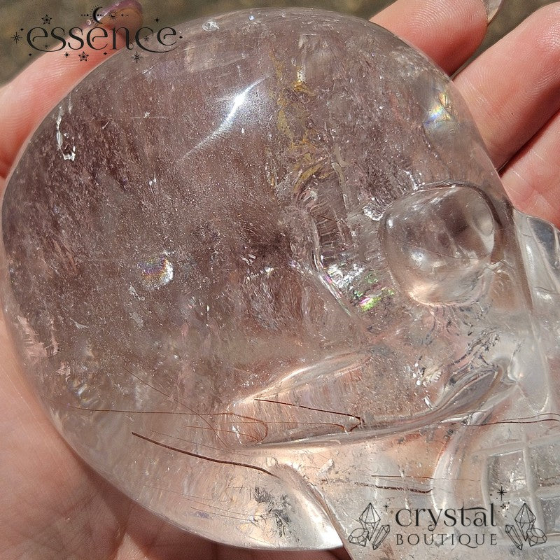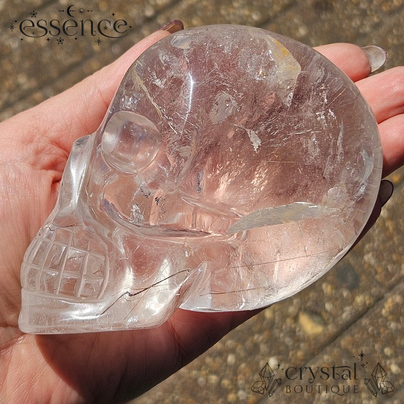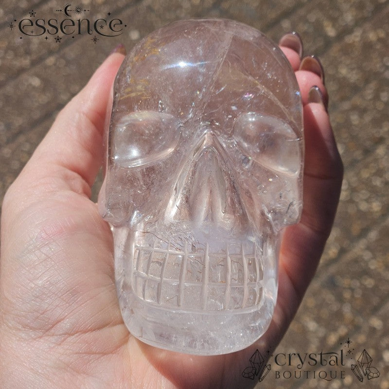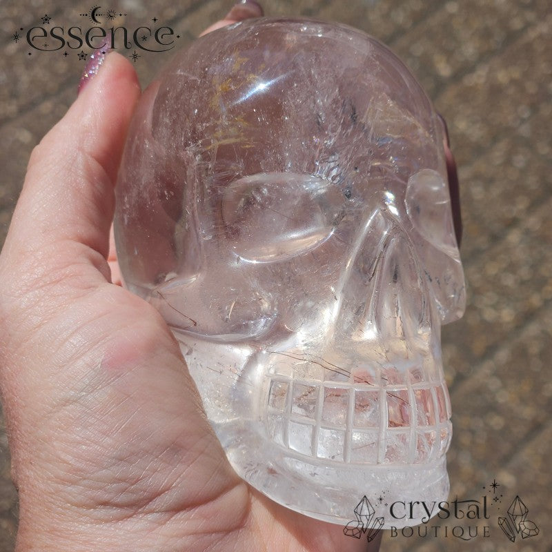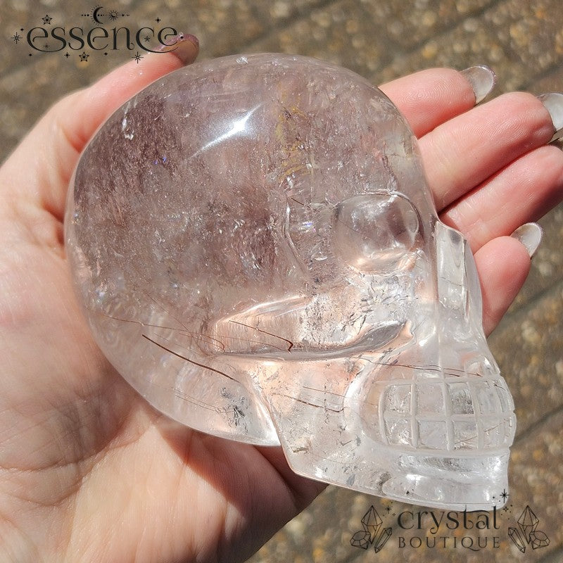 Photos have been taken in a mix of settings — outdoors in natural daylight, on a light base, and under indoor lighting — to capture the skull’s clarity, inclusions, and reflective qualities as accurately as possible.