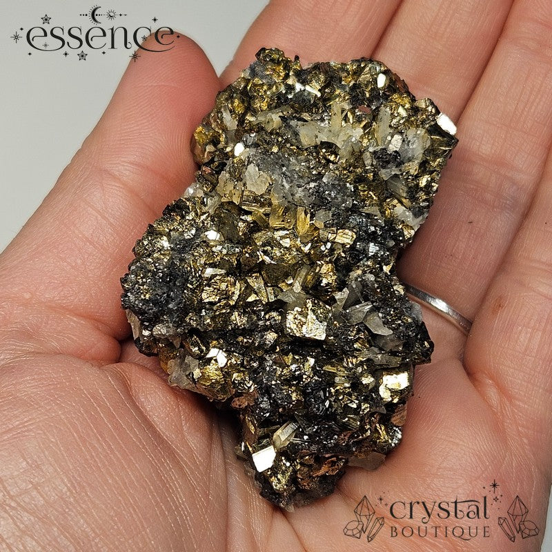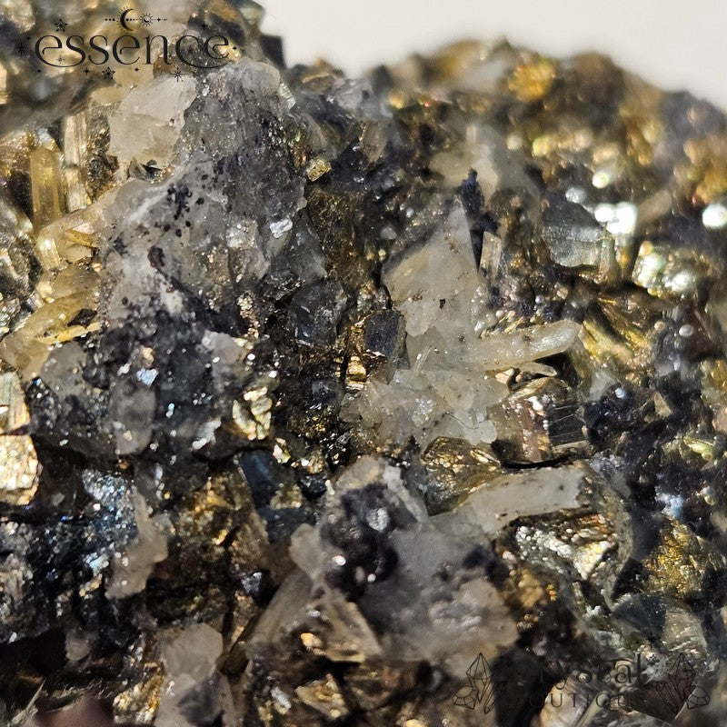This striking specimen combines shimmering metallic hues with natural crystalline textures, making it ideal for display, meditation, or energetic work.