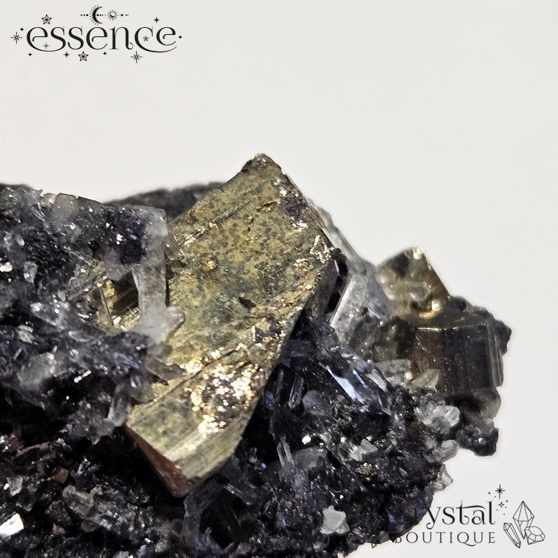 This naturally formed specimen showcases the intricate interplay of metallic luster and shimmering quartz, offering both visual appeal and energetic versatility. Whether you're adding to your collection, using it in meditation, or displaying it in your home, this crystal is sure to impress.