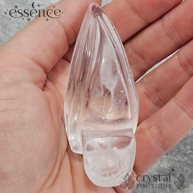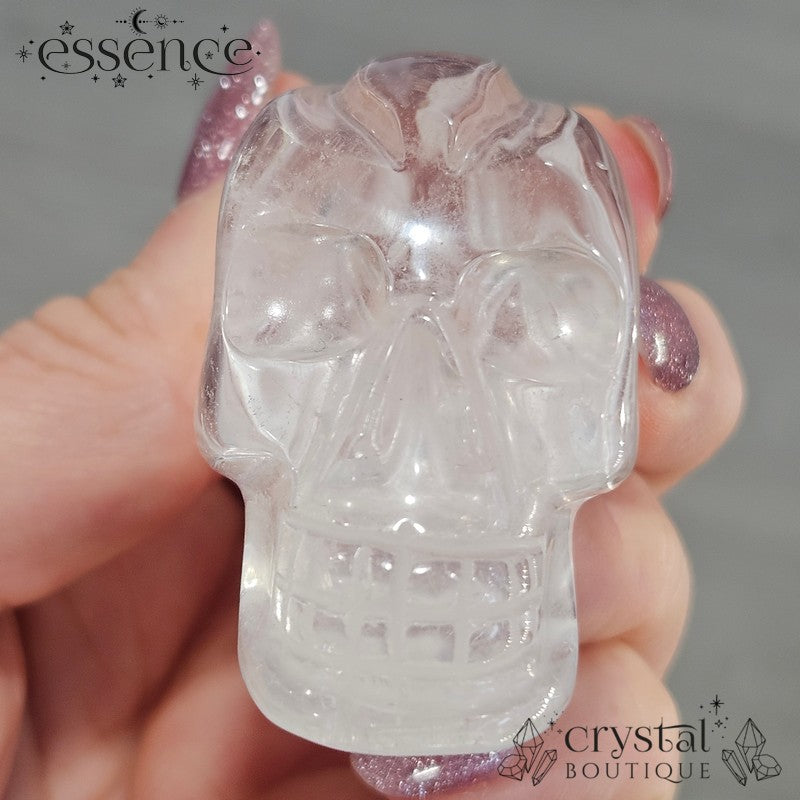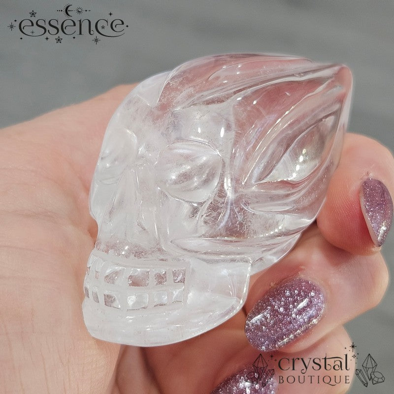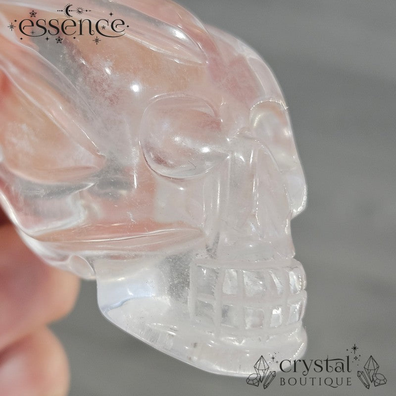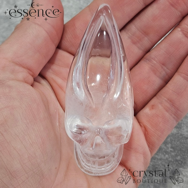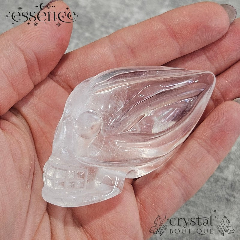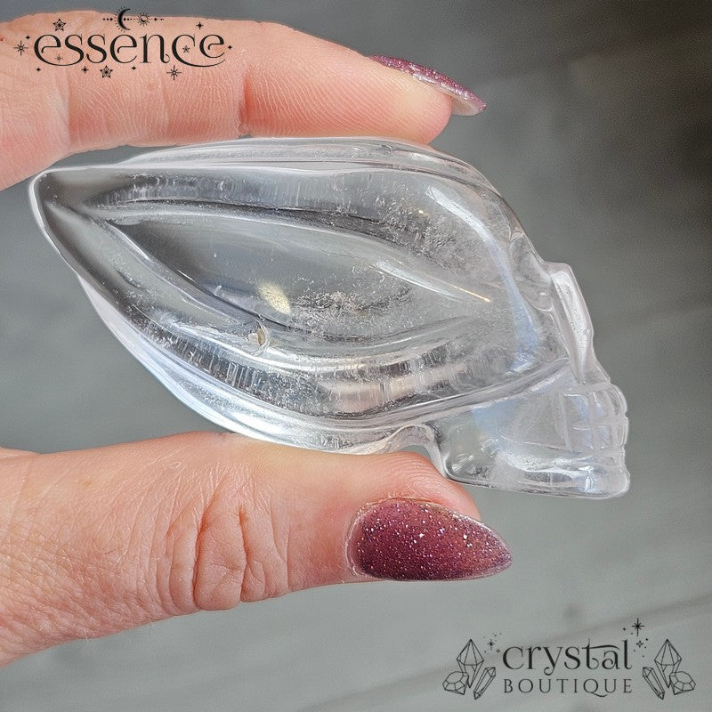 Whether you see an alien, a wise traveller, or something entirely otherworldly—this beautifully carved clear quartz skull is bound to spark curiosity, and features that stretch the imagination, this unique piece brings serious galactic explorer energy.