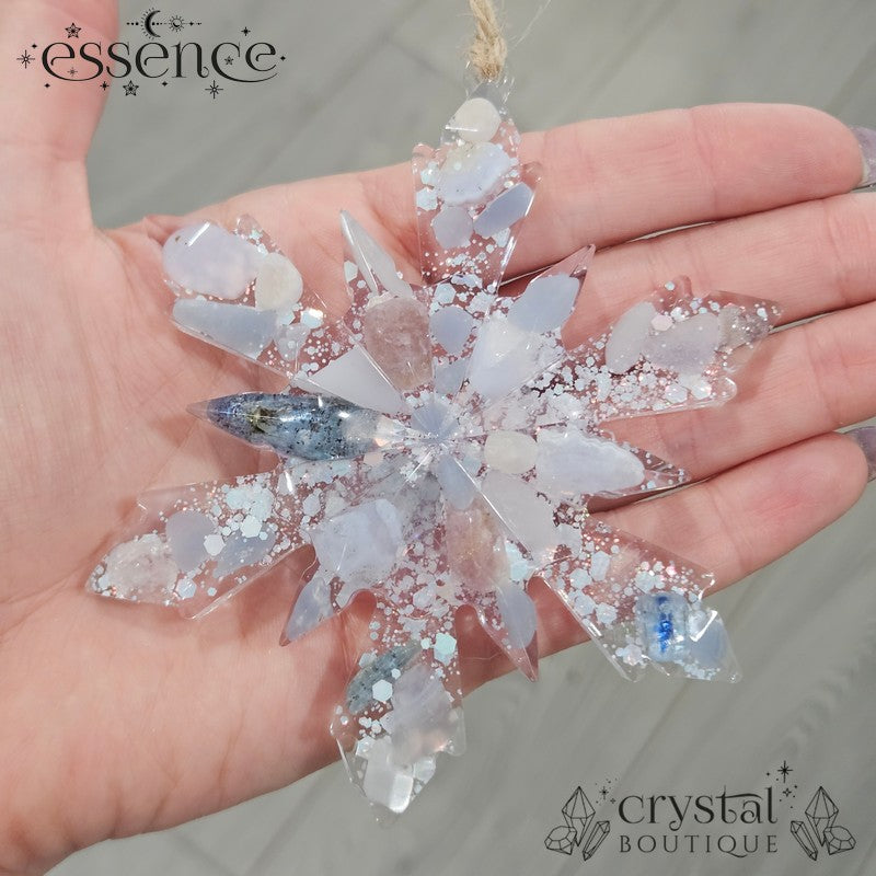 Bring the magic of winter indoors with this one-of-a-kind handmade resin snowflake, filled with shimmering crystal energy. Each snowflake is unique, featuring carefully placed chips and points of: