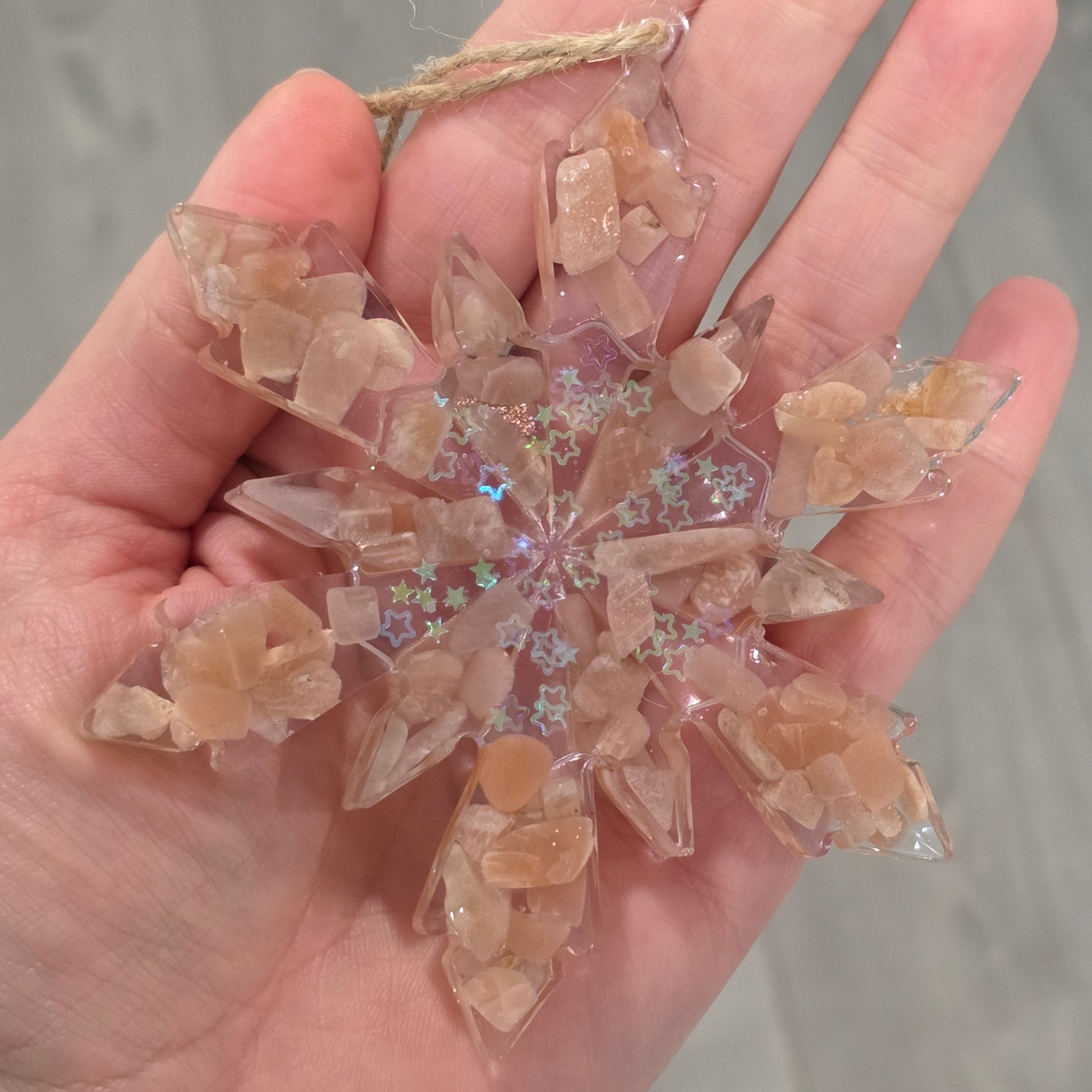Sun + moon energy in one luminous snowflake. Soft peachy moonstone meets glowy sunstone flashes — a celestial blend that feels warm, dreamy, and just a little bit magical. Glittered with starshine and ready to hang anywhere you need cosmic cheer.