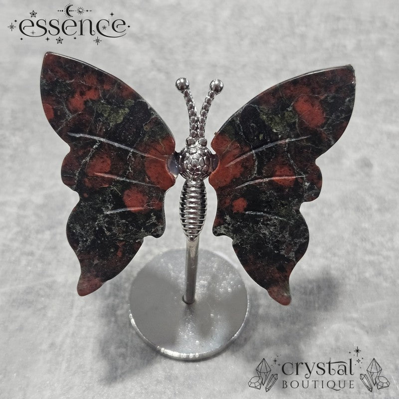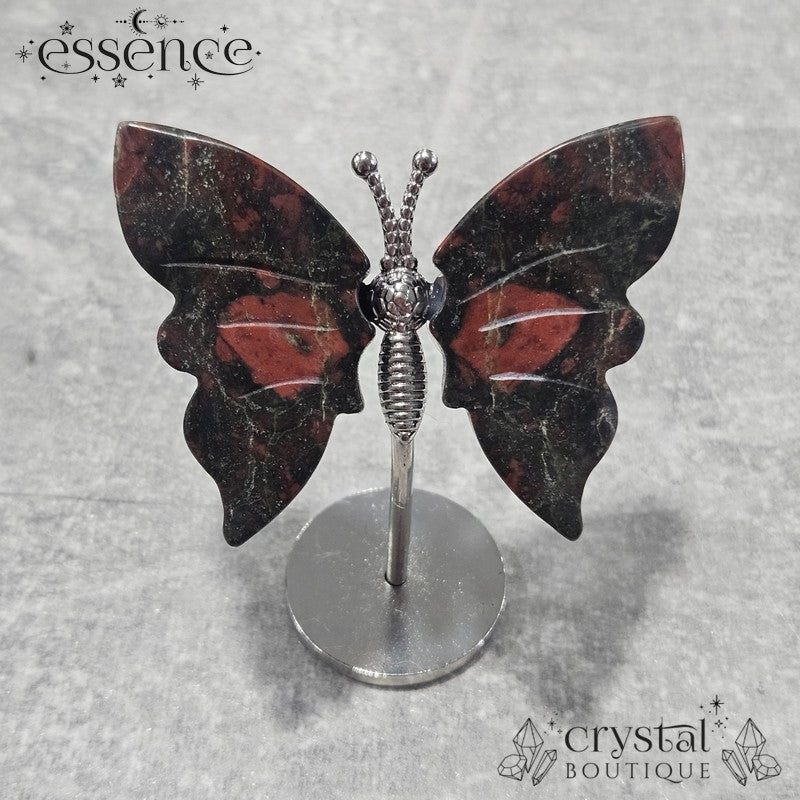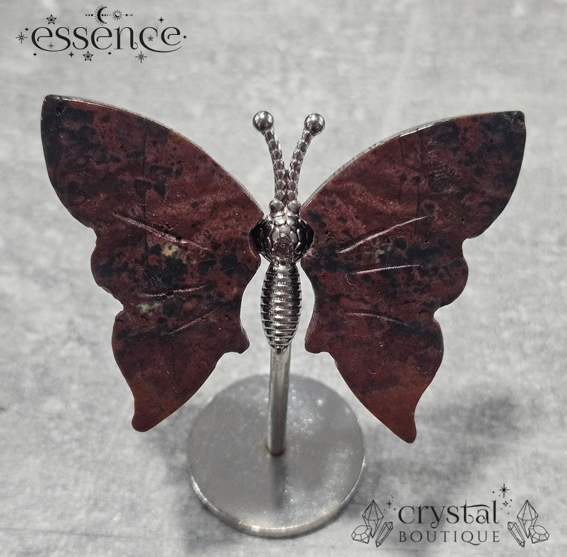 These beautiful Dragonblood Jasper butterflies are full of grounding energy and transformation. Each one has been carefully carved from natural stone and set on a silver-toned metal stand β perfect for adding a touch of earthy strength to your home or workspace.