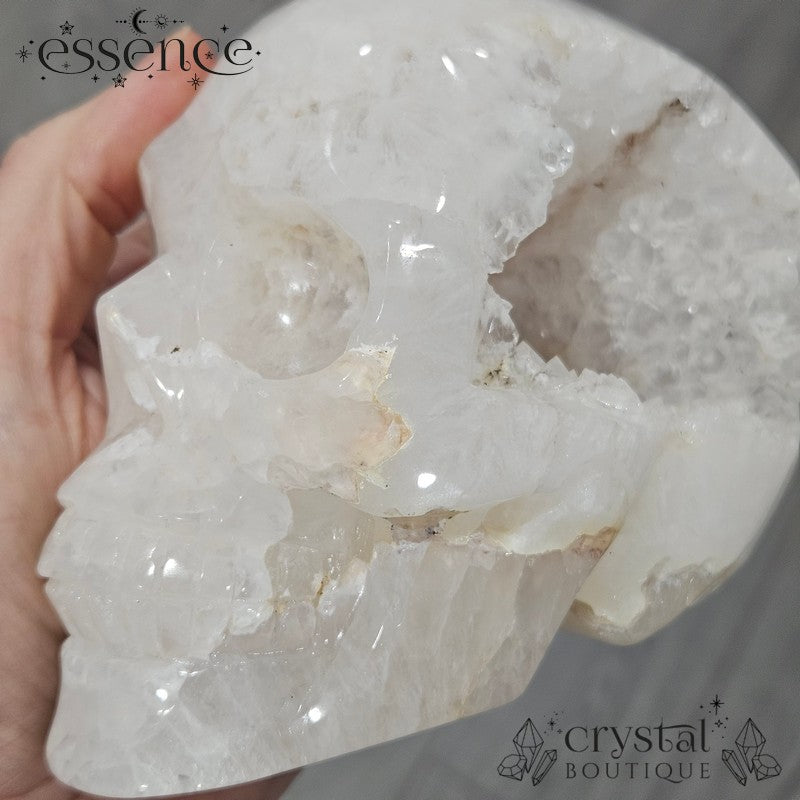 The smooth, milky outer surface contrasts perfectly with the raw crystal cavity, giving this skull loads of depth and character. You’ll notice subtle internal textures, natural lines, and areas where the quartz becomes slightly more translucent — all part of its natural growth.