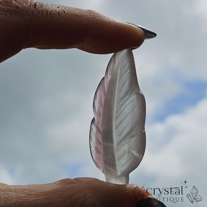 Delicate and full of peaceful energy, this hand-carved Fluorite feather features a dreamy blend of lavender, soft blush, and translucent zones — capturing the magic of air and spirit in crystal form. It's a one-of-a-kind piece, chosen intuitively for those who are ready to embrace clarity, flow, and calm direction.
