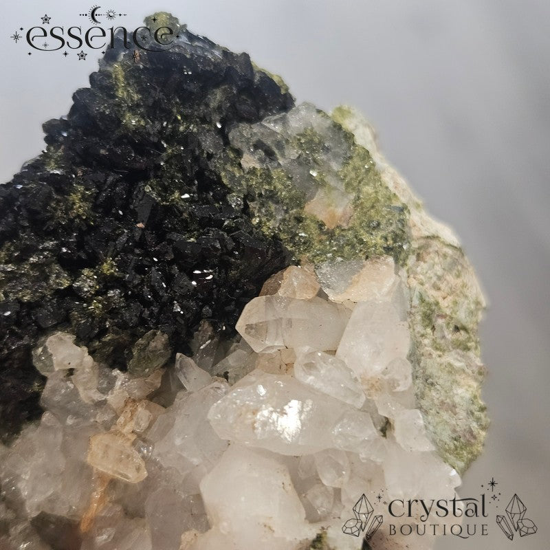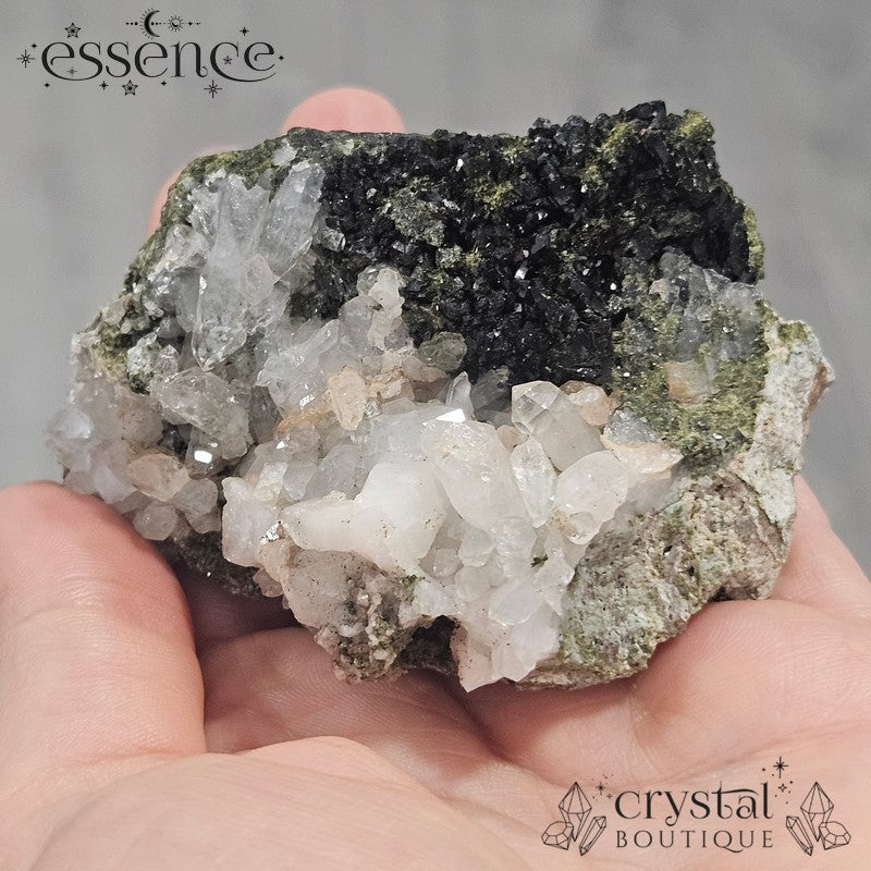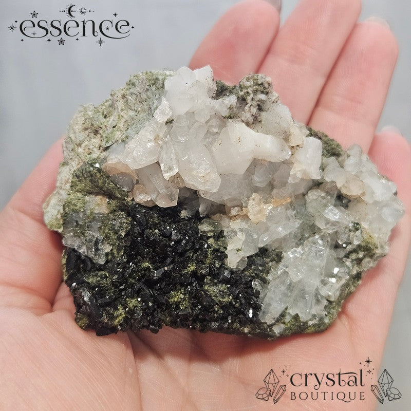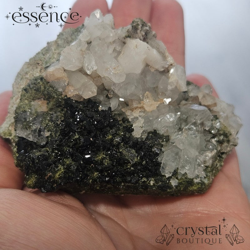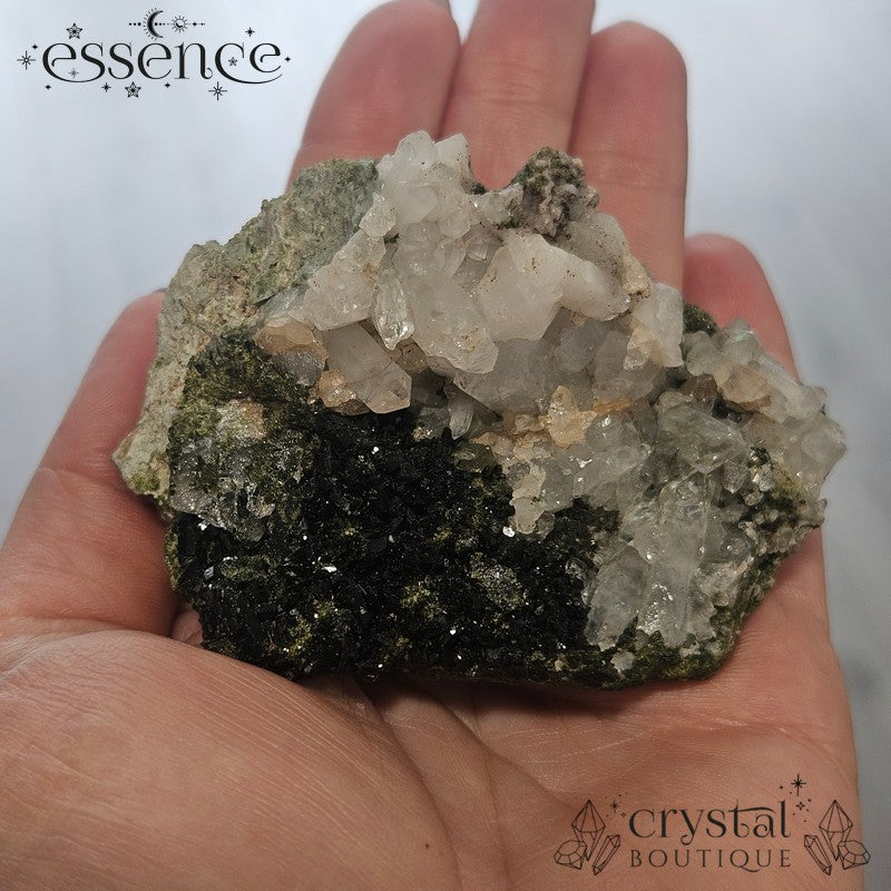 This chunky little stunner is giving “ancient forest floor but make it crystal.” With sharp quartz points nestled up against glossy green-black epidote and mossy matrix vibes, it’s basically a crystal-sized nature documentary — minus the mud.