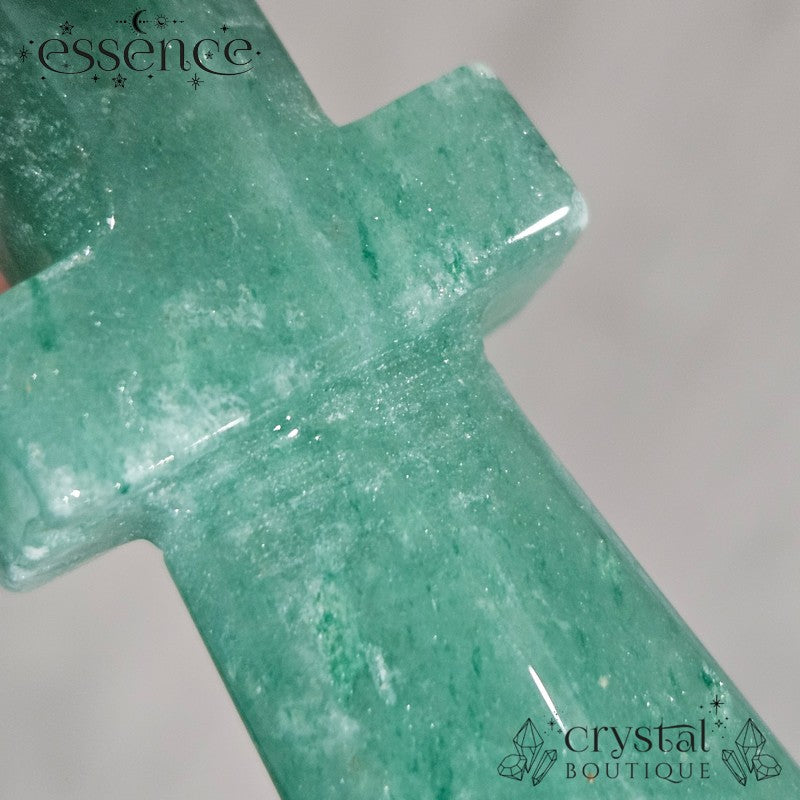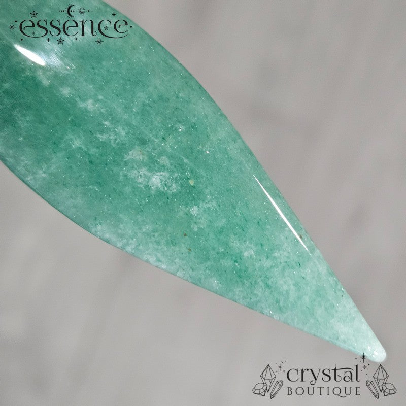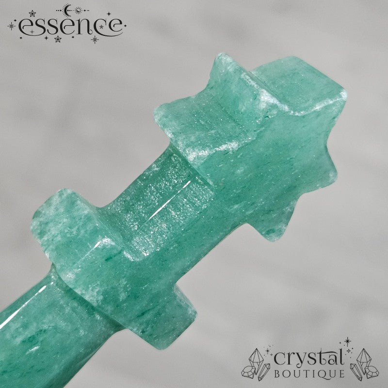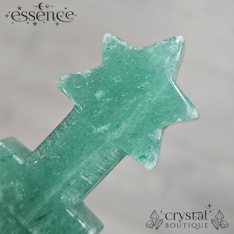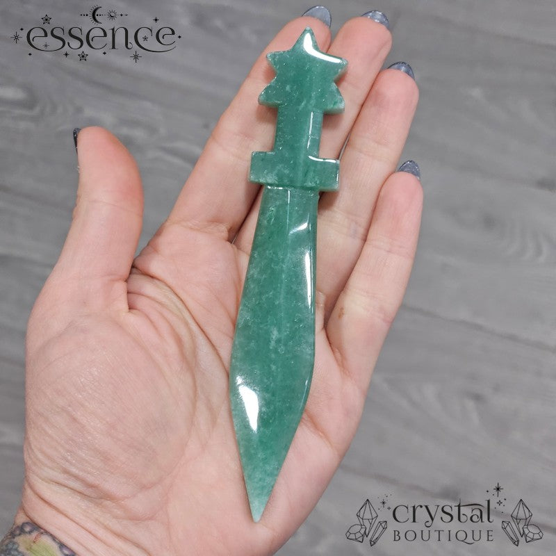 This carved Green Aventurine dagger features a rich, earthy green tone with natural shimmer from its fuchsite inclusions. Shaped into a star-topped blade and polished to a glassy finish, it carries a bold yet soothing energy.