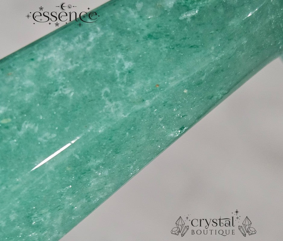 Green Aventurine forms through quartz-based mineral growth layered with shimmering mica particles, creating its signature sparkle and gentle depth. This piece is smoothly finished and carved to highlight both structure and stone.