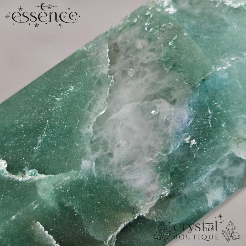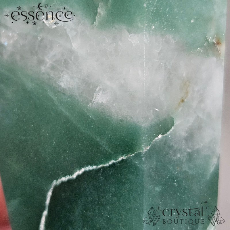 Green Aventurine is a variety of Quartz, enriched with Fuchsite inclusions that give it its signature green colour. In this piece, those shimmering greens are dramatically offset by veins and pools of pure Clear Quartz, the master healer stone. This blend occurs when silica-rich hydrothermal fluids crystallize over time in cavities and fractures within the Earth, creating intricate layers and growth patterns.