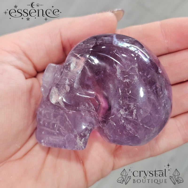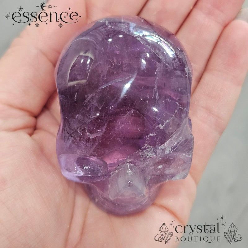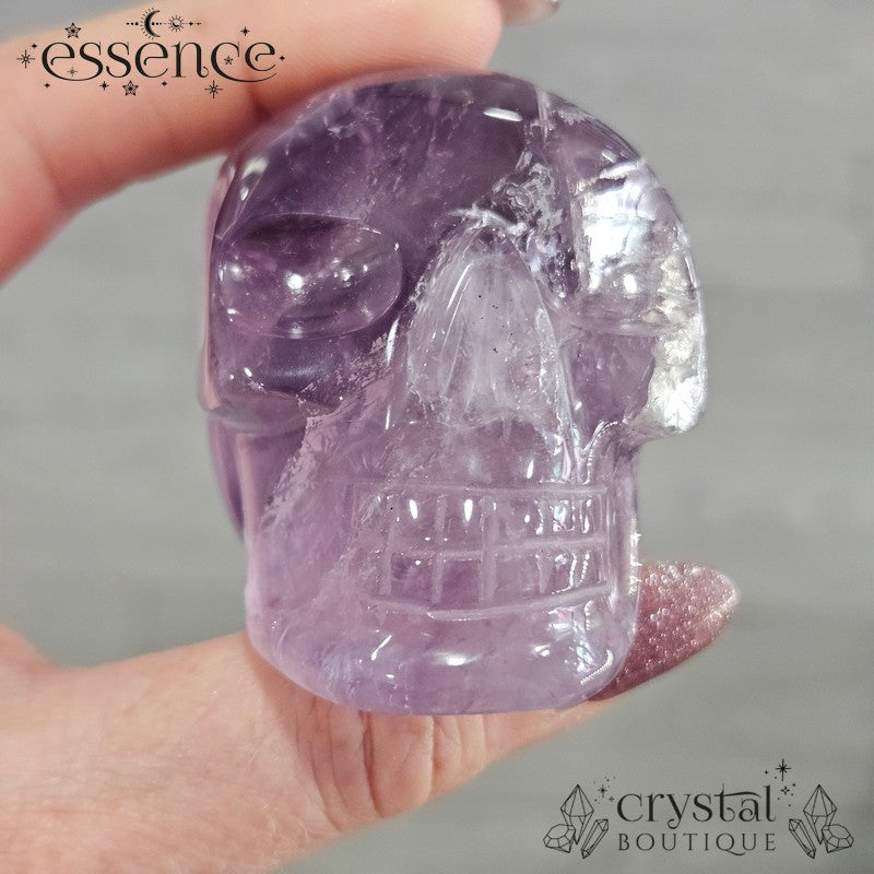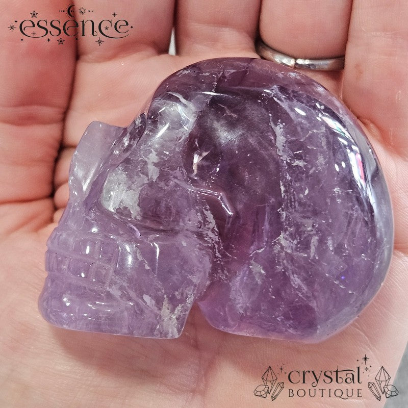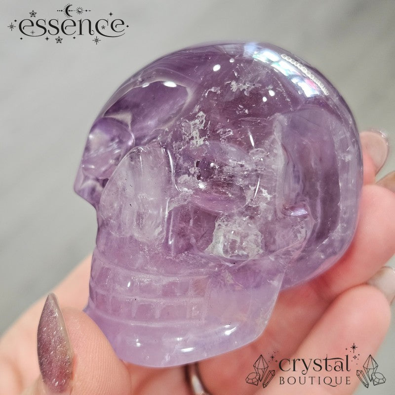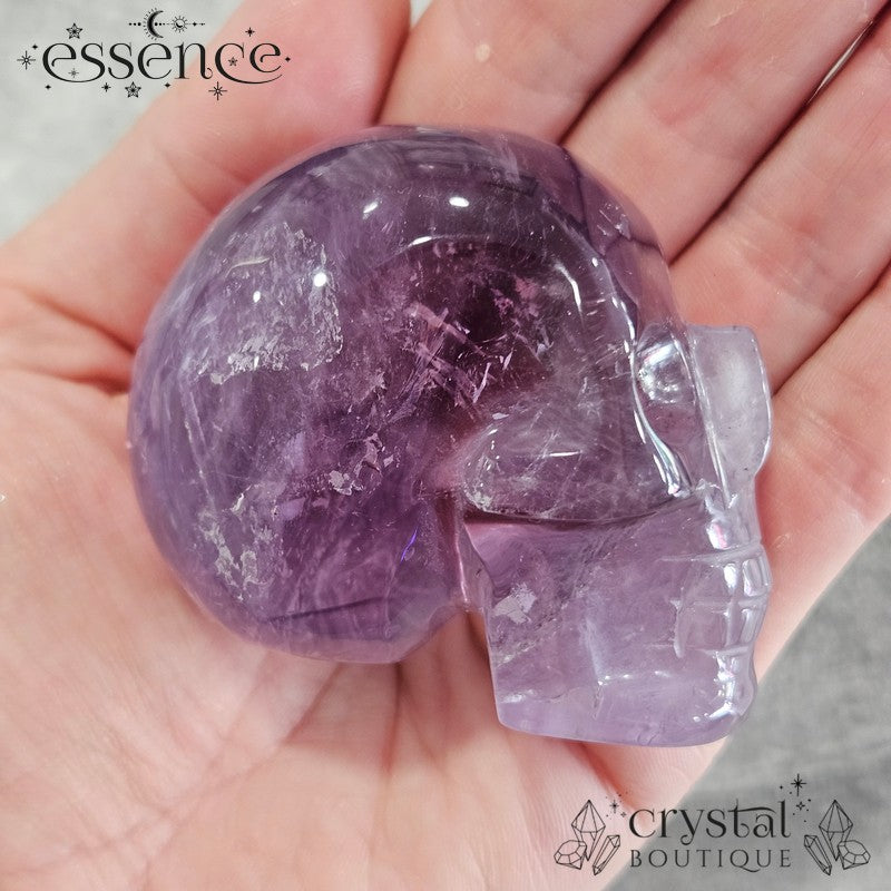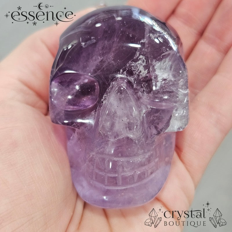 This captivating 199 g skull has been carved from rich Brazilian Amethyst, its deep violet tones swirling with shimmering transparency and natural inclusions. Each angle reveals new details—tiny fractures, colour shifts, and crystal planes that catch the light beautifully.