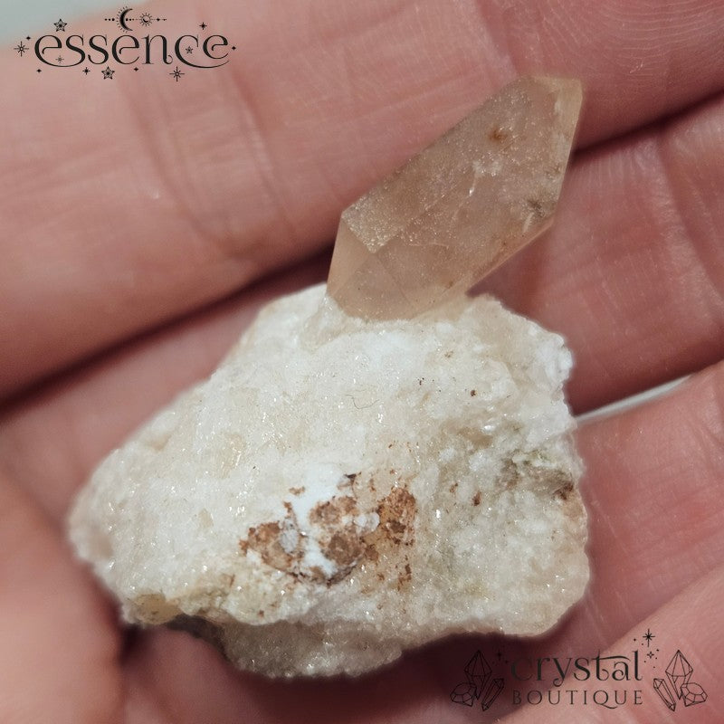 A deeper, smoky-peach double-terminated point that feels bold and earthy. Its bright crystalline matrix makes the colour pop — a standout piece with beautiful contrast.
