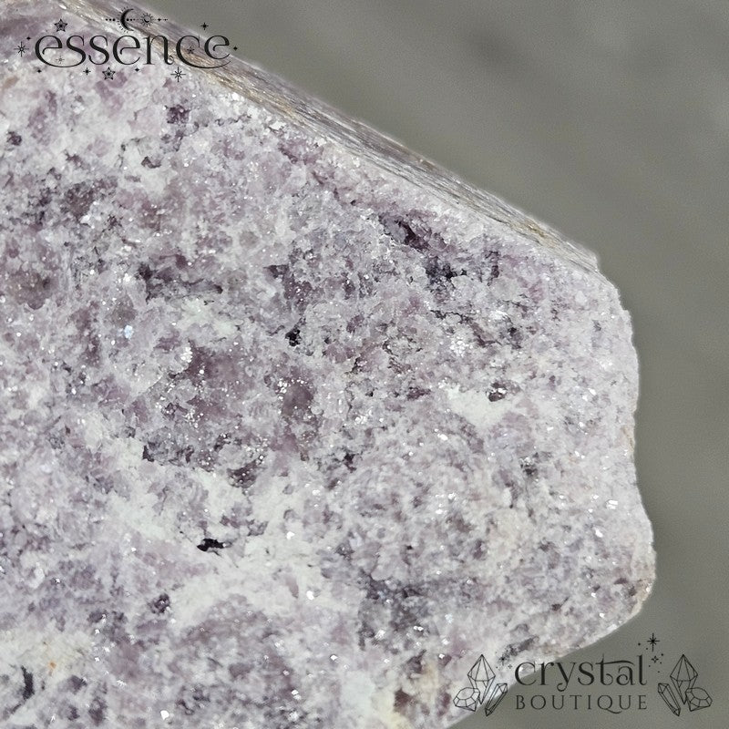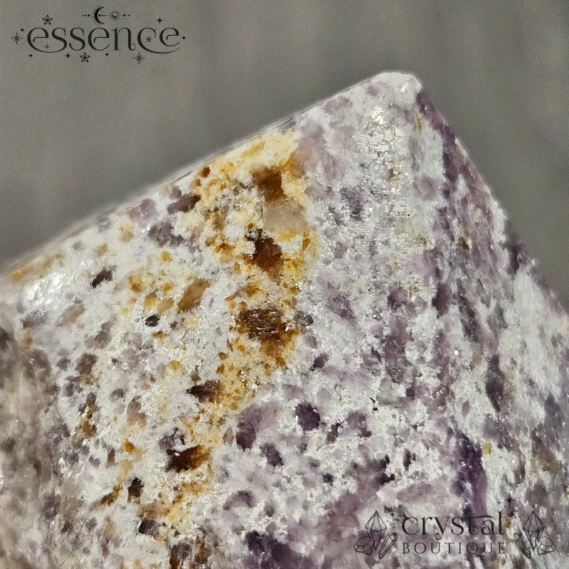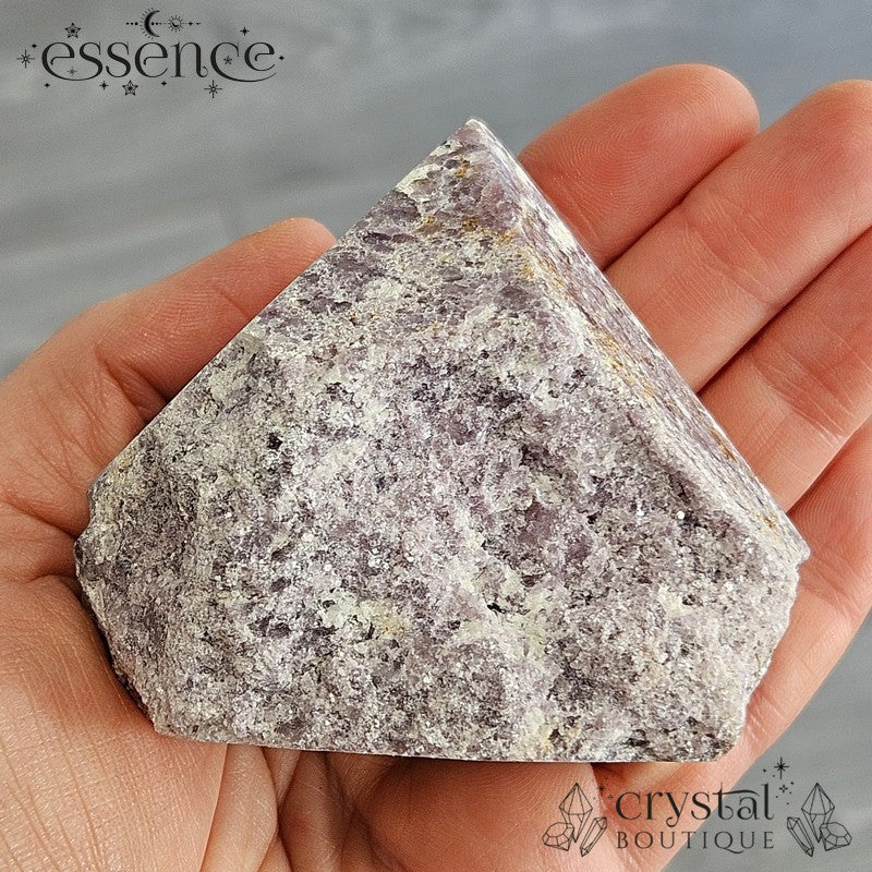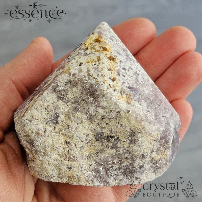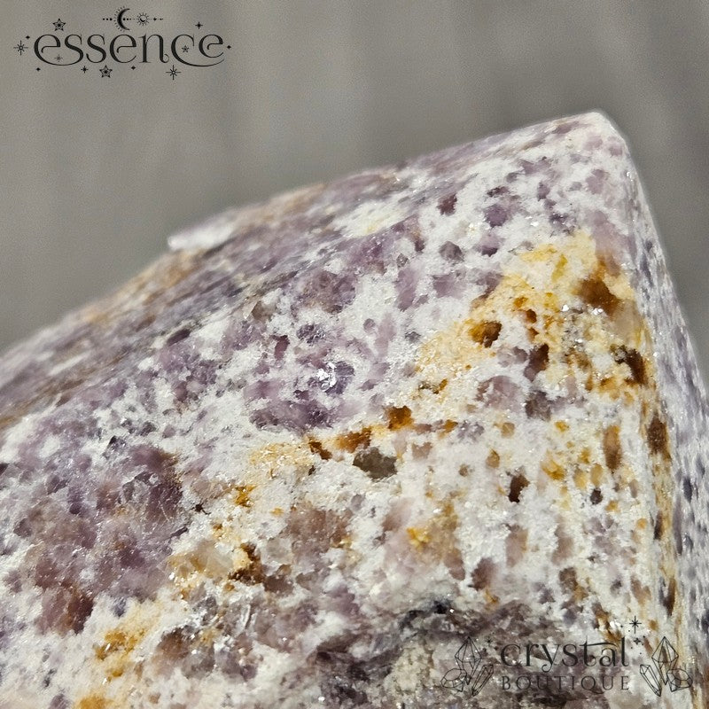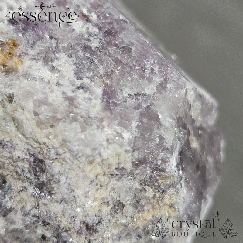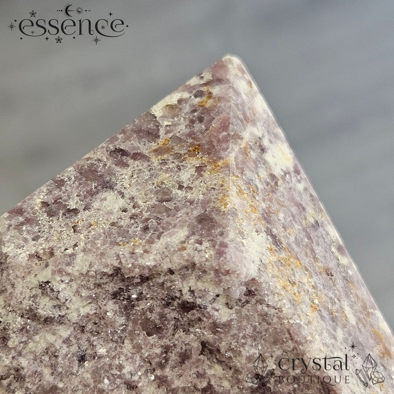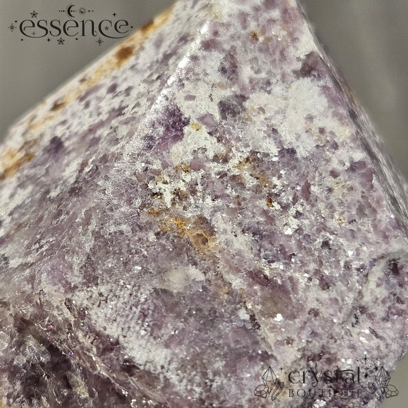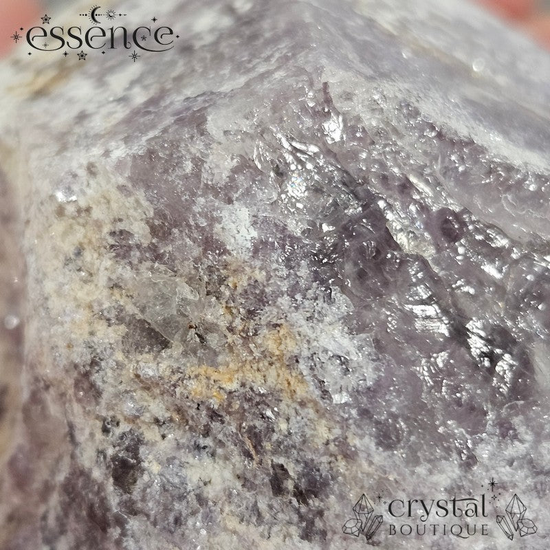 Bring calming energy into your space with this 270g Shimmery Lepidolite Cut Base Point. This stunning piece is packed with natural shimmer, thanks to its high mica content, creating a dazzling effect under the light.