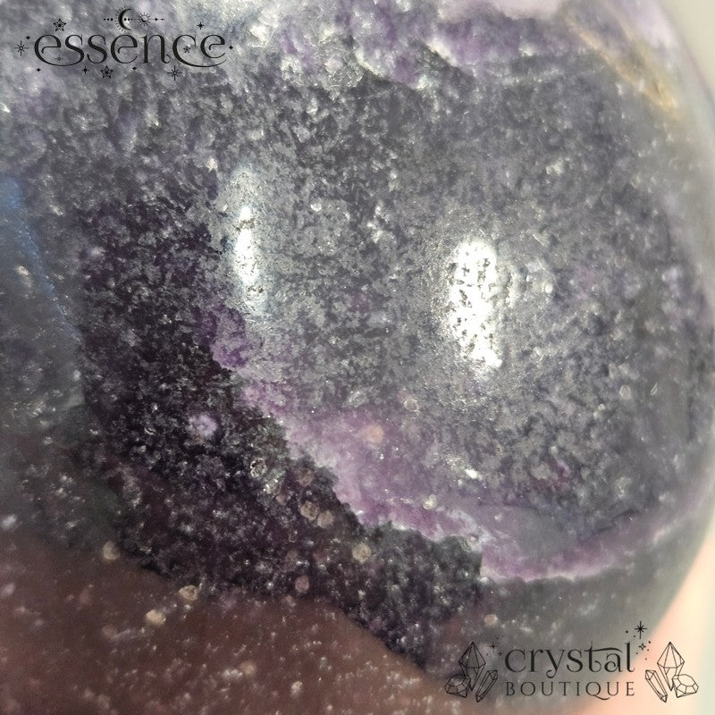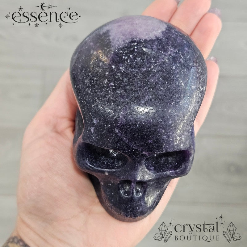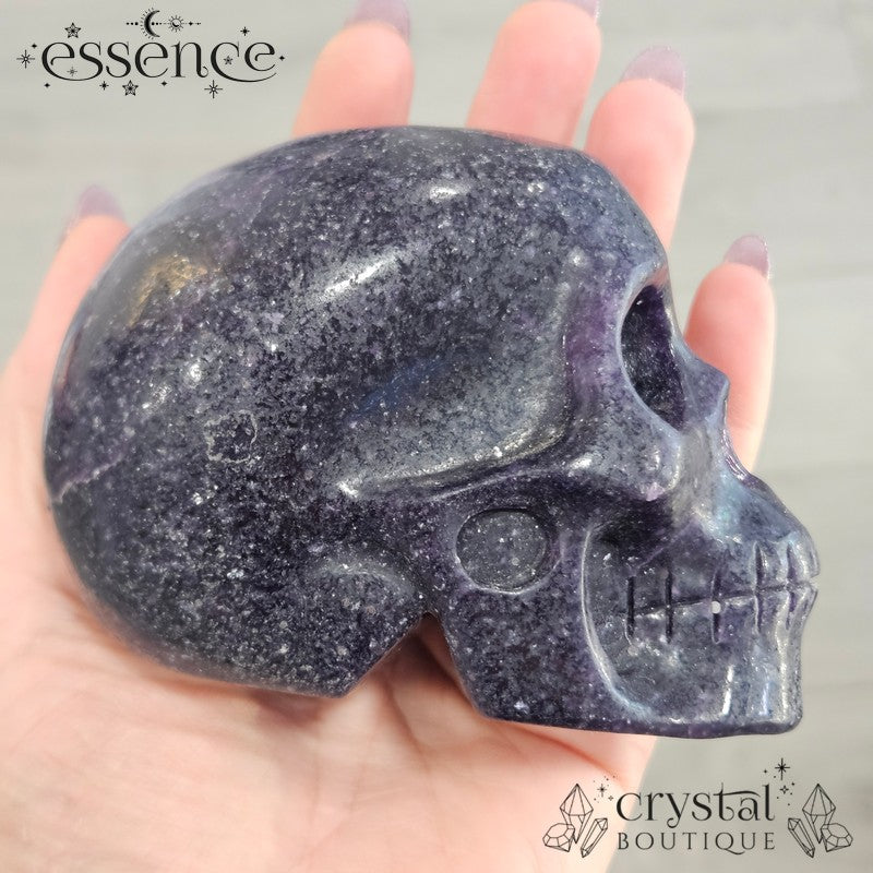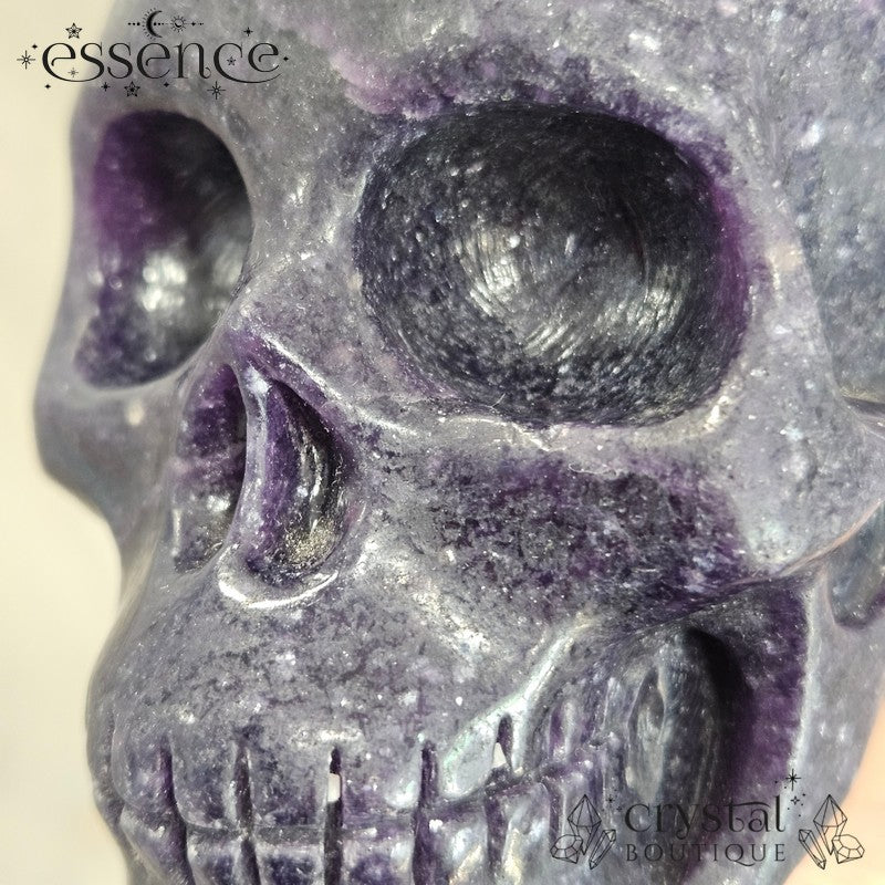 This chunky Lepidolite skull is all about presence. Hand-carved at 812g, he’s a striking piece with deep dark purples swirling into lighter lilac tones at the crown. The surface carries a natural shimmer from Lepidolite’s mica content, giving him that subtle sparkle when the light hits.