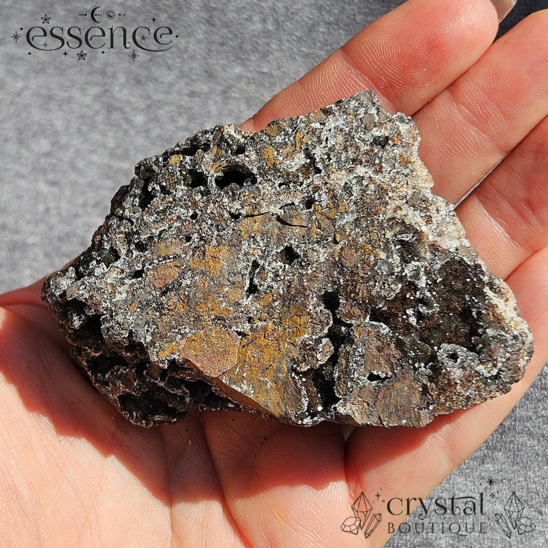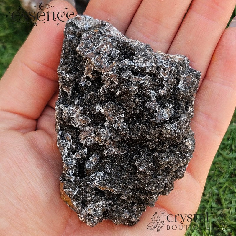 This one is a deep-space dream. A mostly-manganese piece with ultra-fine glitter that lights up in the sun like a pocket of stardust. The texture is wild—bumpy, bubbly, and super satisfying to touch. There’s a hint of white calcite scattered across the surface, but this one’s all about the manganese: earthy, rich, and full of sparkle.