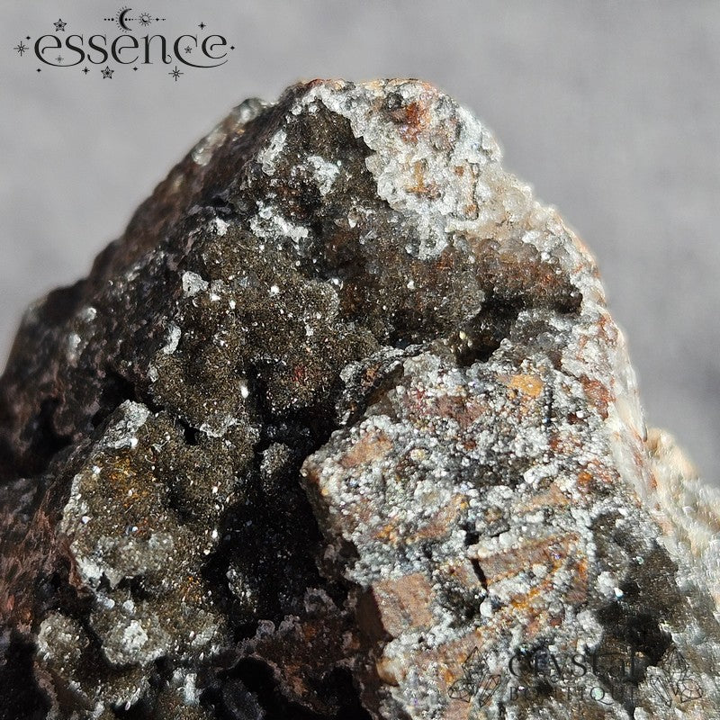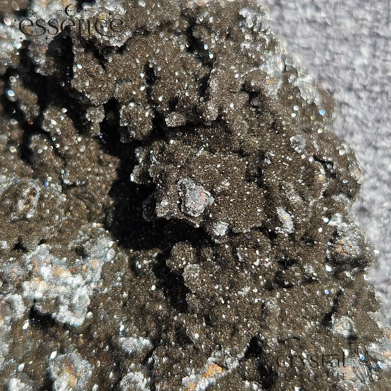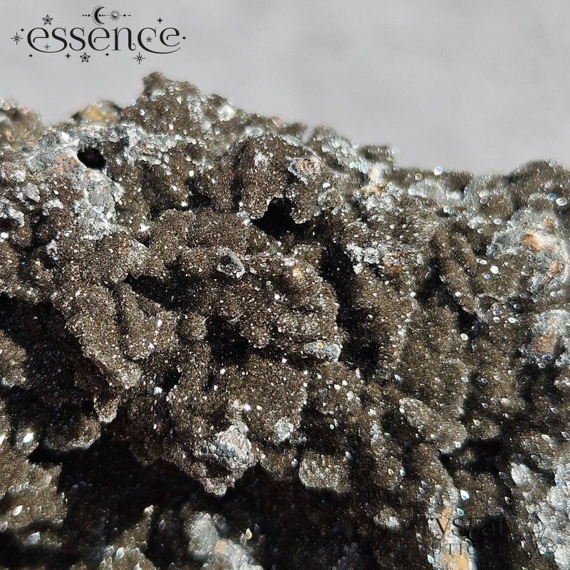 Photos don’t quite do this one justice—it has that twinkle that only shows up when you catch it in just the right light. It’s got a cave-like look on one side, with layers of sparkle across the dark mineral surface. Like nature’s own glitter bomb, but moody.