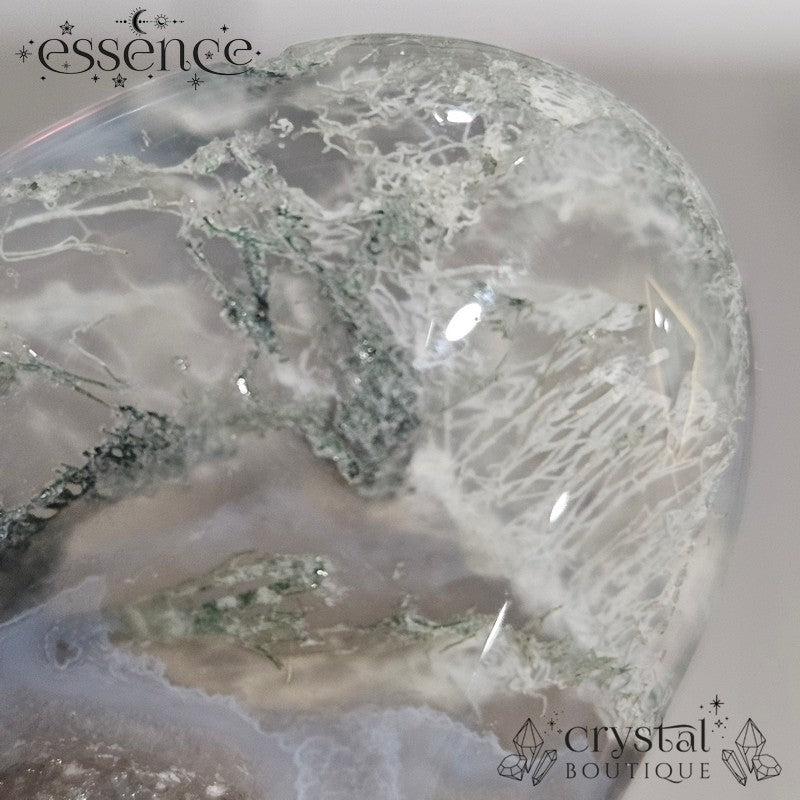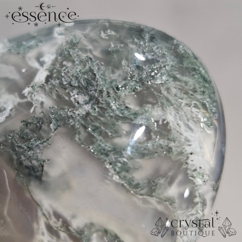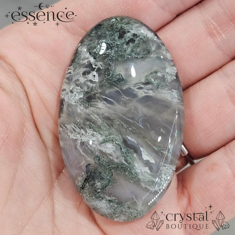 Moss Agate isn’t actually moss at all! The green, branch-like patterns are inclusions of minerals like chlorite or hornblende that grew inside clear or milky chalcedony over thousands (even millions) of years. As silica-rich water flowed through cracks in rock, it slowly crystallised, trapping these earthy, moss-like patterns forever inside. The result? A stone that looks like Mother Nature painted miniature forests inside quartz.