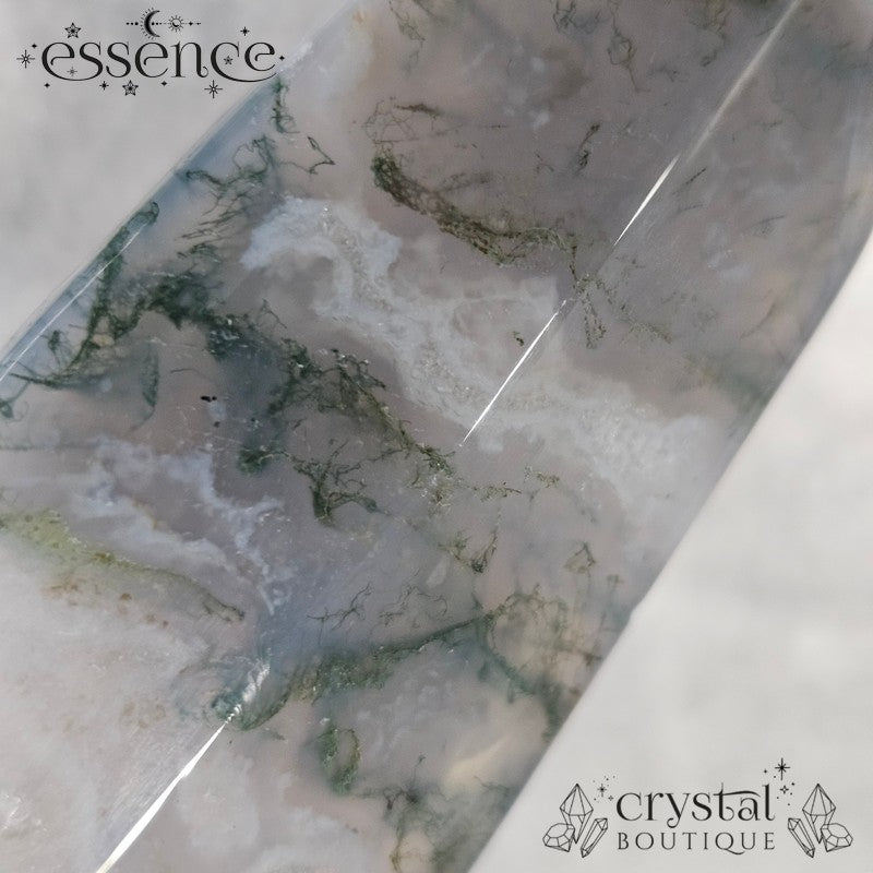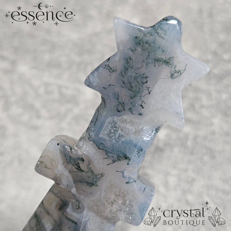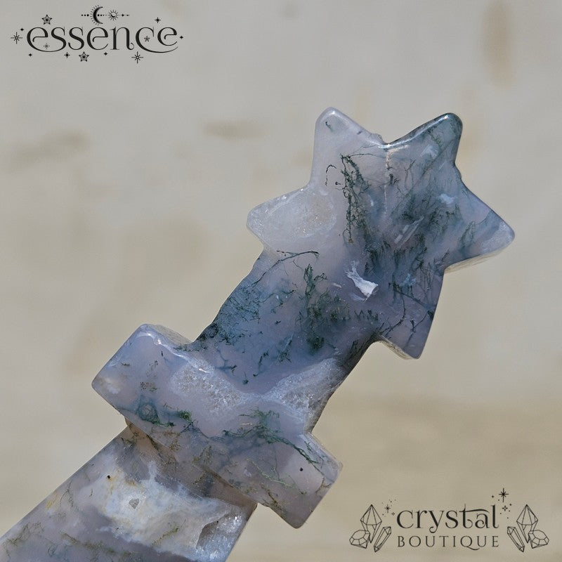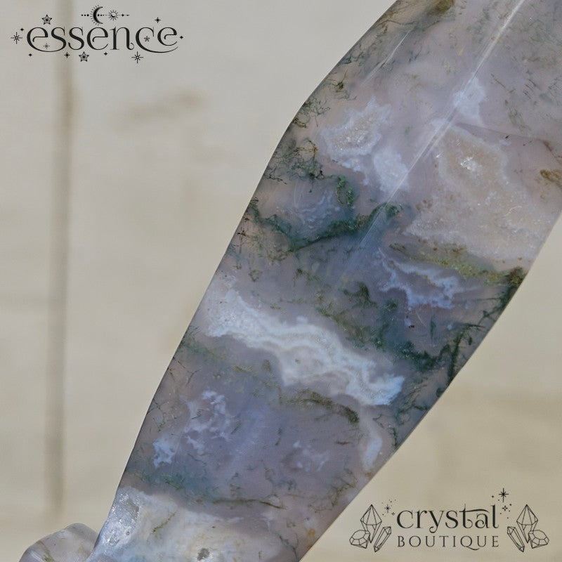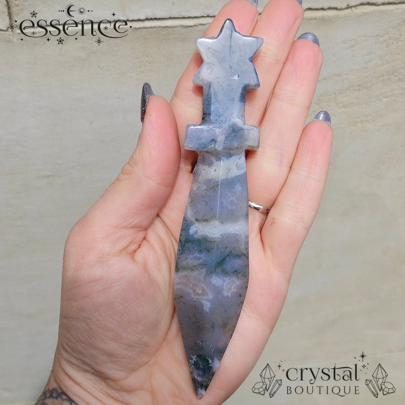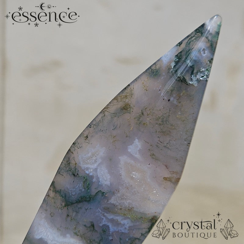 Channel grounding energy and nature’s power with this hand-carved Moss Agate Dagger. A unique collector’s piece, this polished dagger features beautiful swirls of green and earthy tones, mimicking the look of a misty forest. Moss Agate is known for its stabilizing and nurturing properties—perfect for spiritual work, altar displays, or as a statement piece in your collection.
