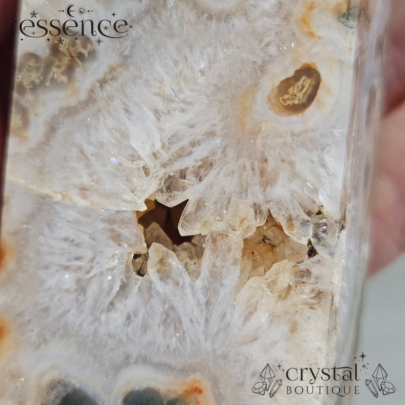 Moss Agate forms when silica-rich water slowly crystallises inside rock cavities, trapping minerals like chlorite or iron that create the branching, plant-like inclusions. Over time, shifts in pressure and chemistry cause cavities to form and sometimes fill with tiny quartz crystals—hence that dazzling druzy sparkle.