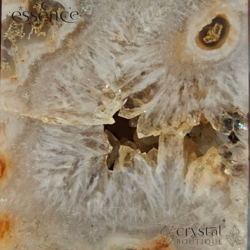This one's got drama and depth. Delicate mossy threads stretch through the stone like tangled tree roots or lightning in a twilight sky. Cloudy whites swirl around honeyed yellows and earthy browns, while a glittering crystalline pocket near the base steals the spotlight—like a cave opening up in the middle of ancient rock. It's full-on enchanted forest energy.