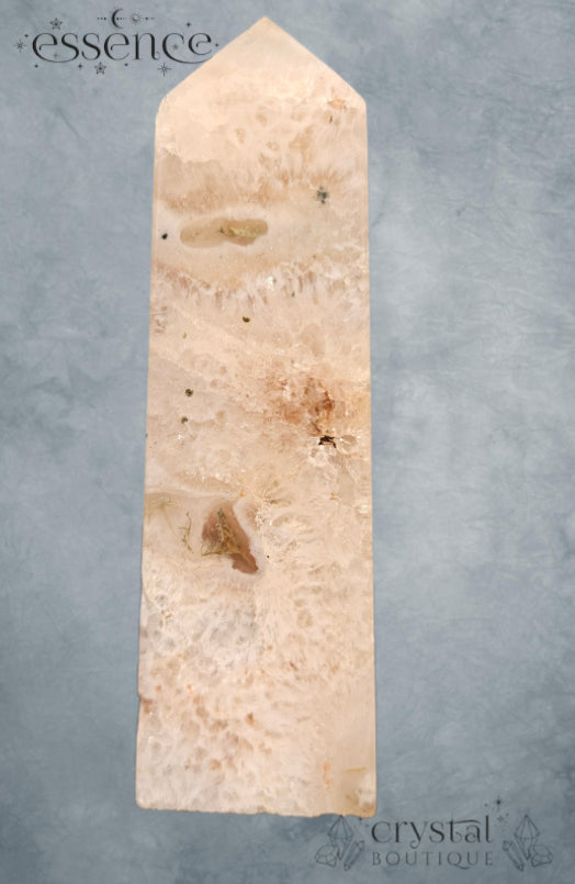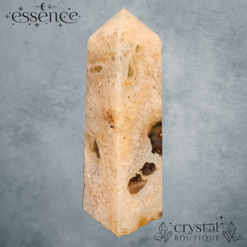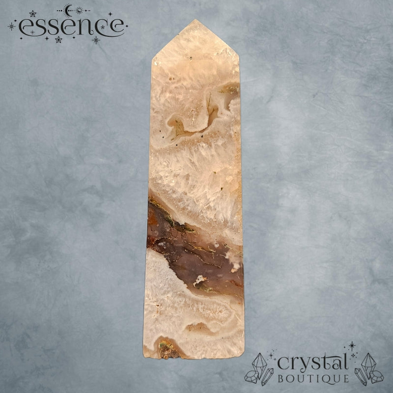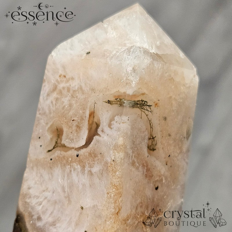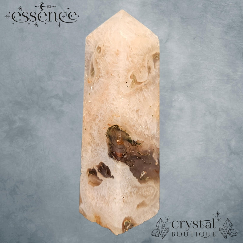 This beauty looks like it’s holding a hidden woodland inside. With creamy white and soft beige as the backdrop, the tower flows into a darker, earthy river of mossy brown tones running through the middle—like a stream meandering through frost-covered ground. Crystalline textures near the surface catch the light like frost on bark, and little specks of green look like ferns or forest moss peeking through.