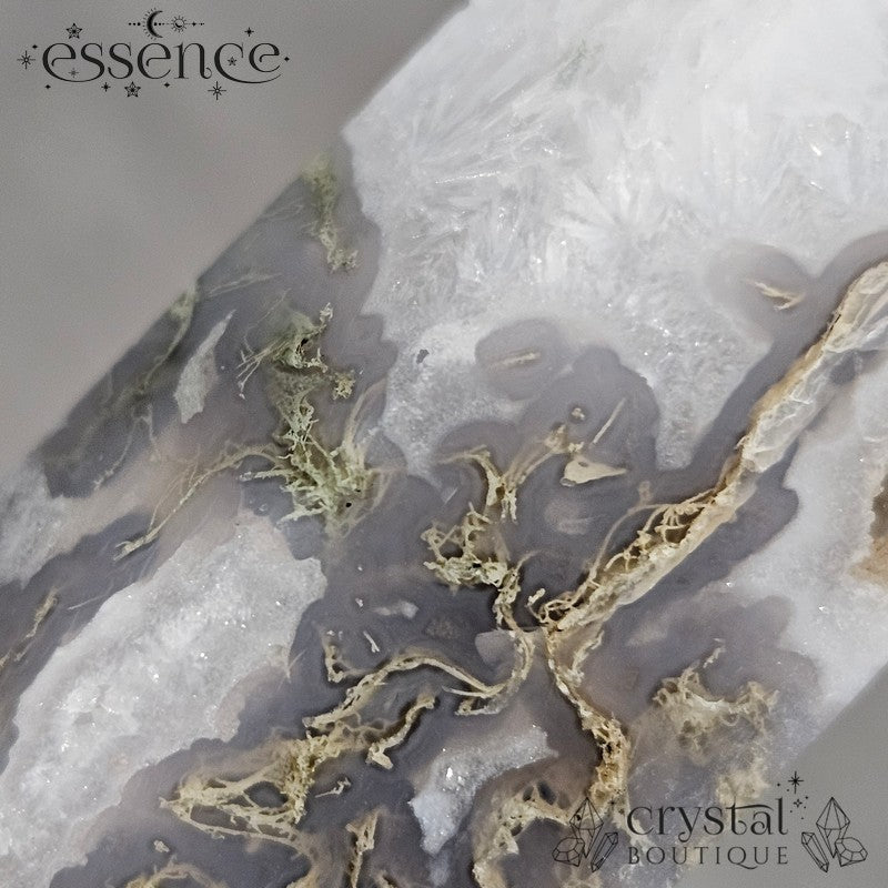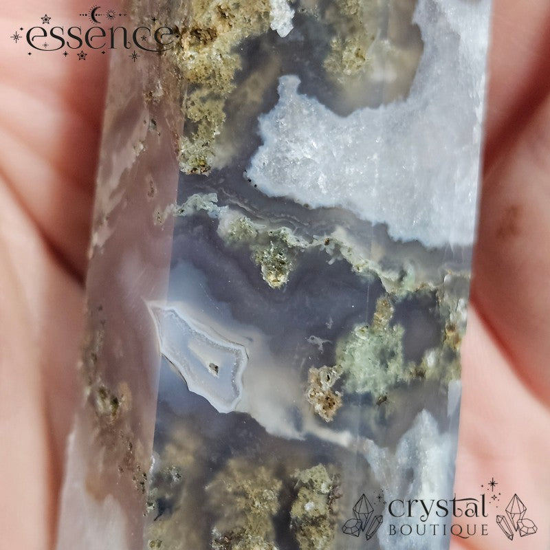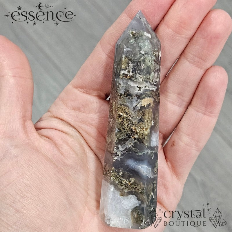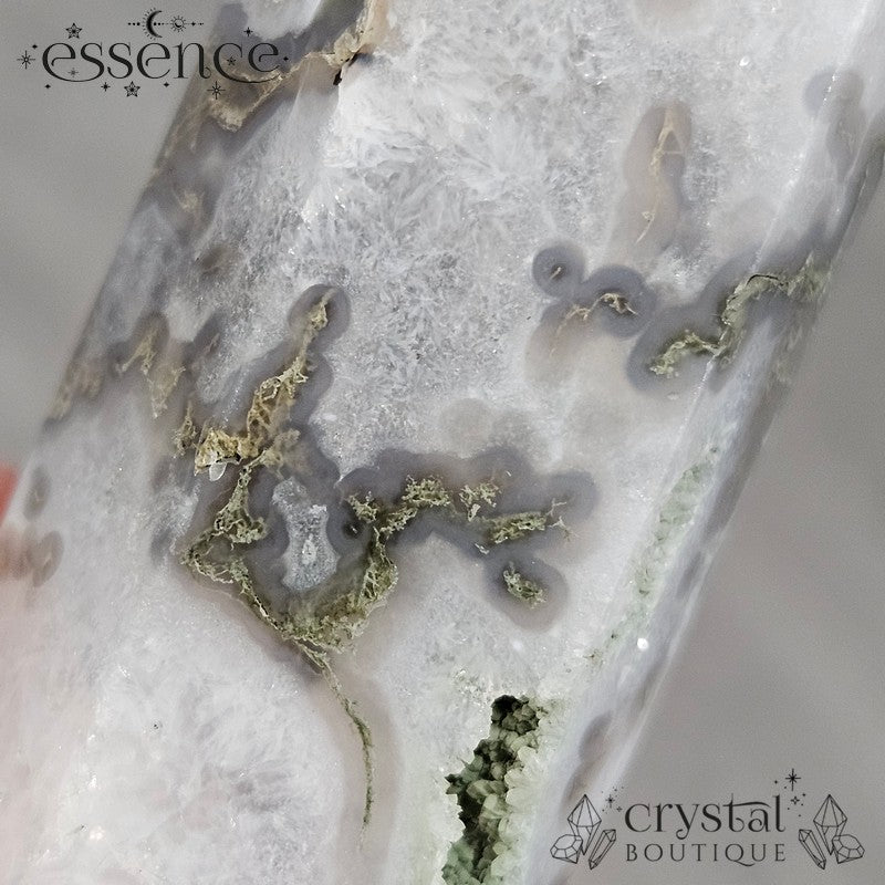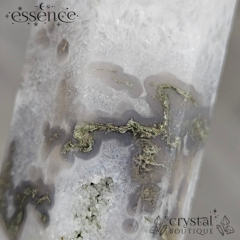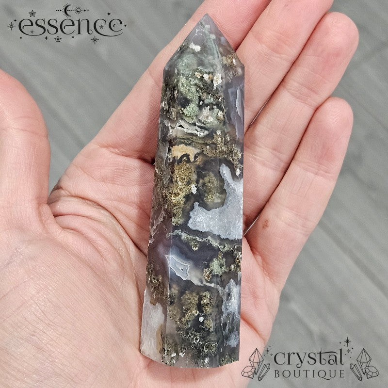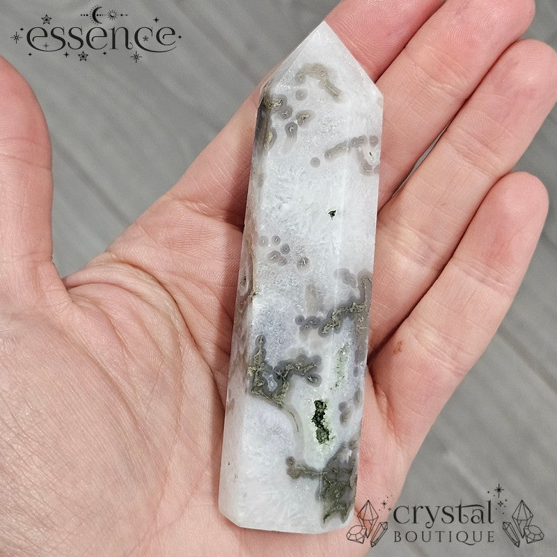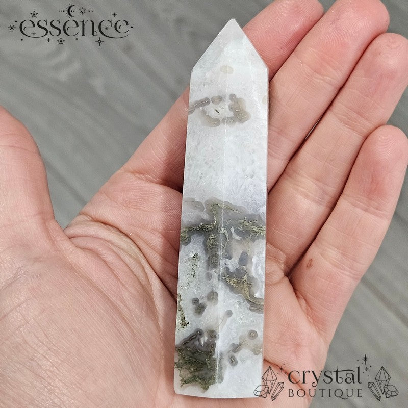This stunning Moss Agate tower is filled with earthy greens, intricate moss-like patterns, and mesmerizing druzy details. A truly unique piece, perfect for crystal collectors and those seeking grounding, abundance, and emotional balance.