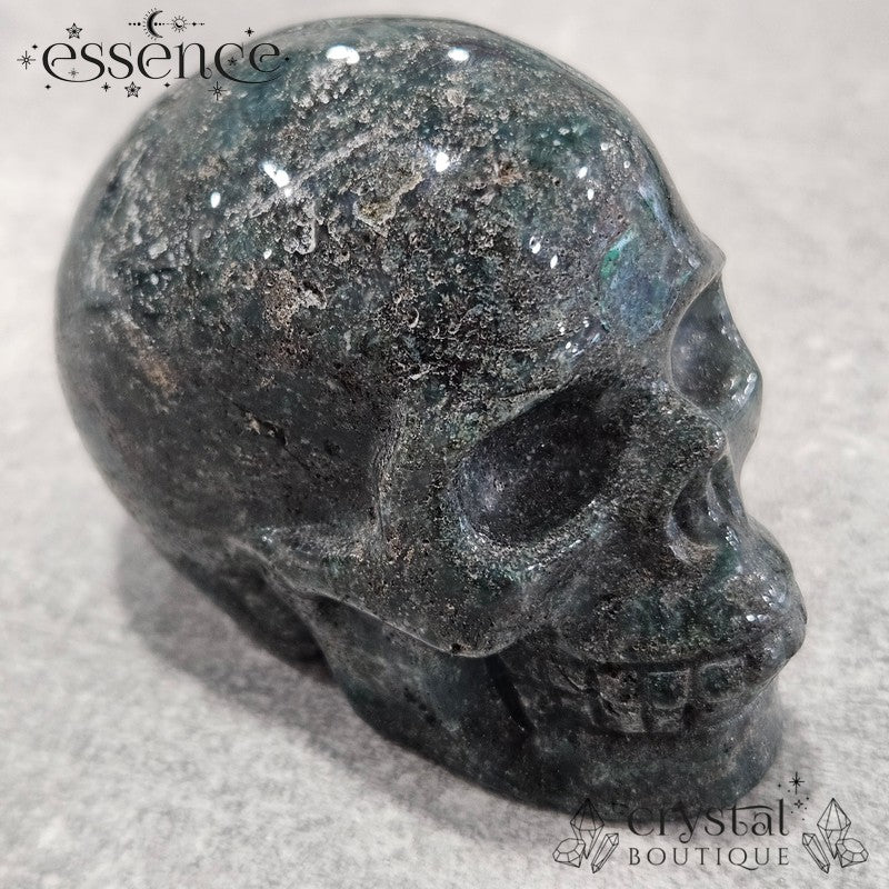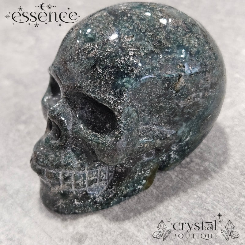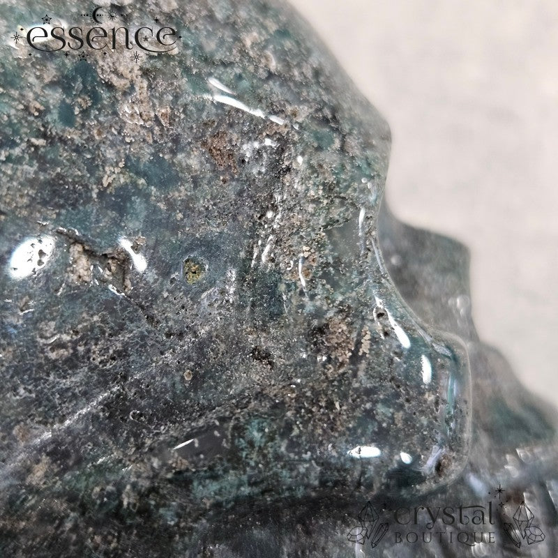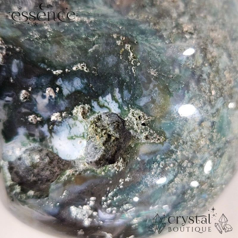 Moss Agate isn’t technically an agate – it’s a form of chalcedony with dendritic (plant-like) inclusions, giving it that beautiful mossy appearance. The pyrite scattered throughout is a natural metallic mineral. This pairing is a rare find and makes this skull extra special.