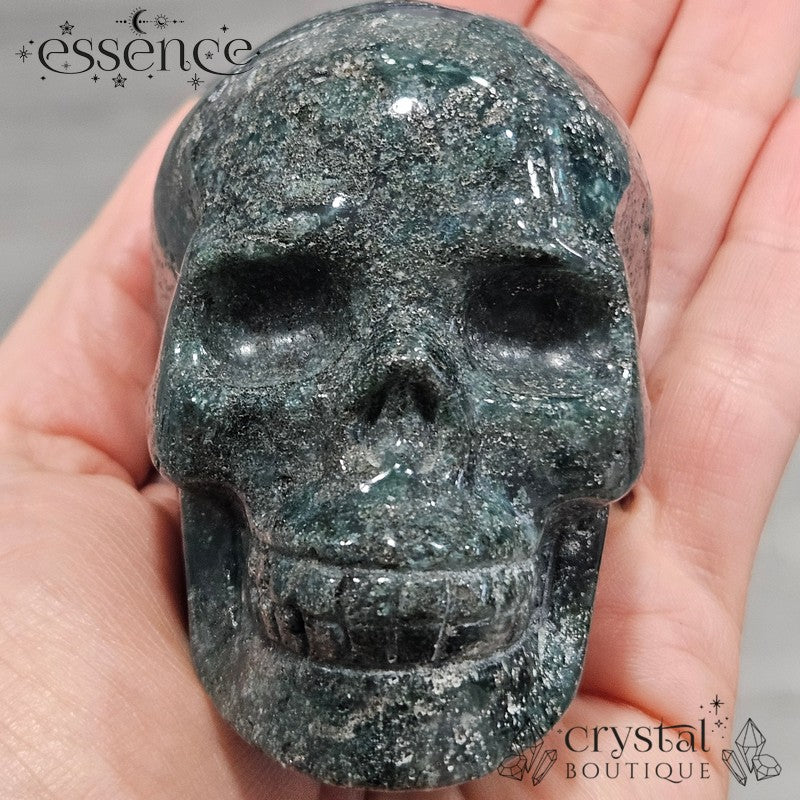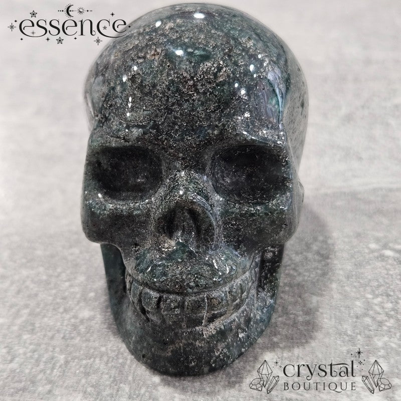 This gorgeous Moss Agate Skull looks like it was plucked straight from an enchanted forest floor. With deep green mossy swirls, hidden landscapes, and a scatter of pyrite sparkle, this piece is wild, ancient, and full of grounding energy.