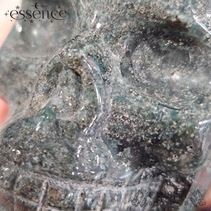 🌲 Forest Alchemy Skull – Moss Agate with Pyrite ✨💀