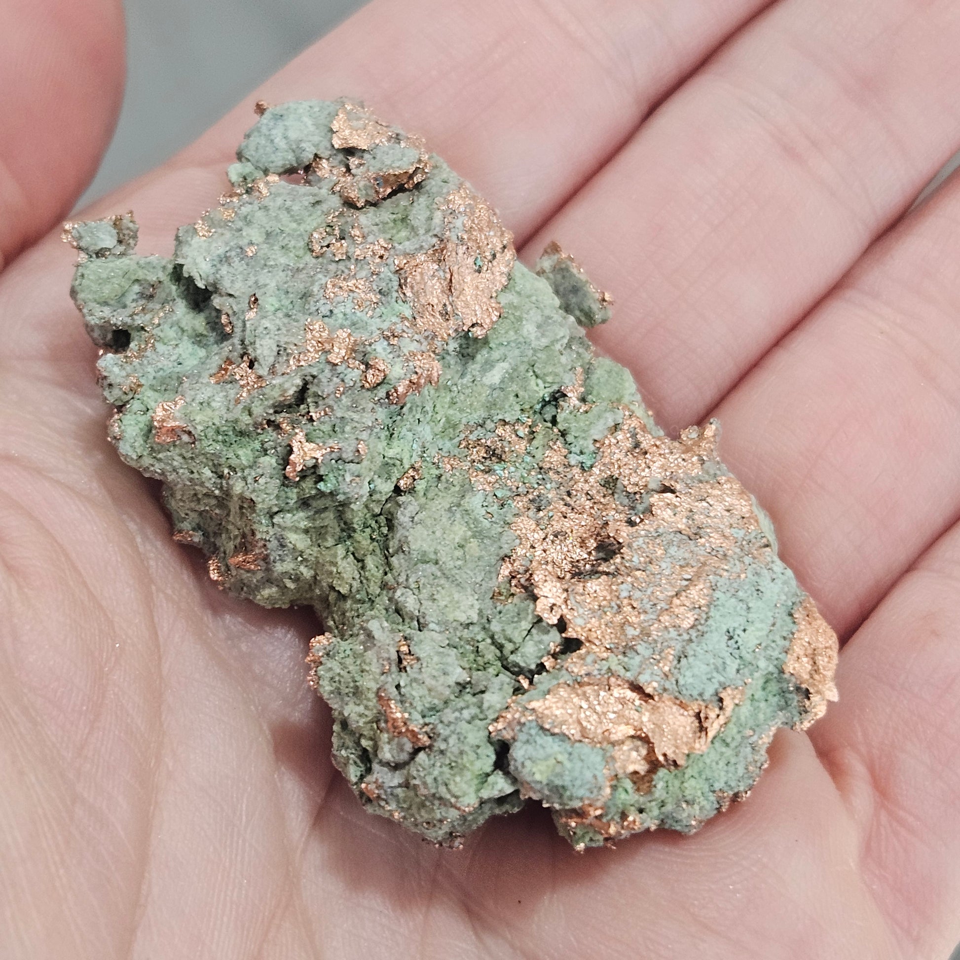 Naturally formed and full of character, these raw copper specimens come straight from Michigan’s Upper Peninsula — one of the only places on Earth where copper occurs in its pure metallic form. Each piece has that unmistakable reddish glow, wrapped in earthy green and stone-grey matrix.