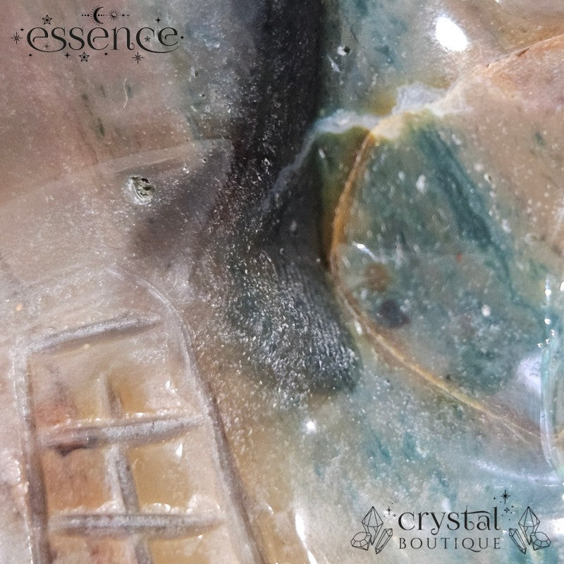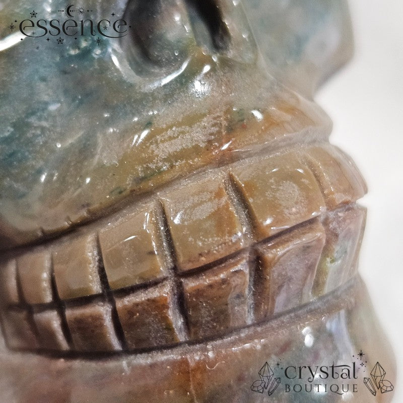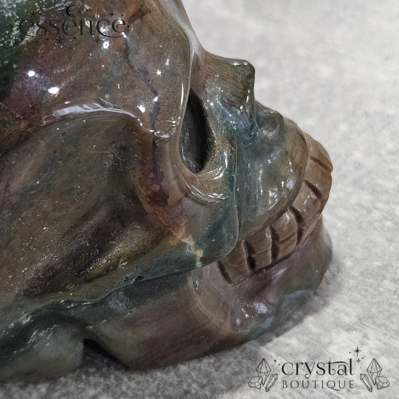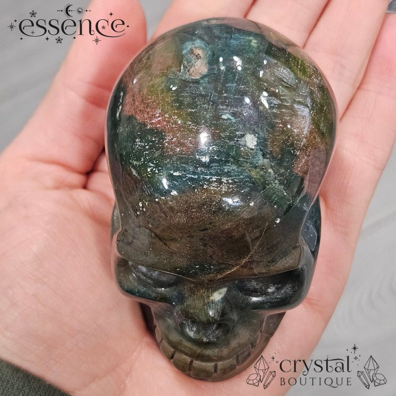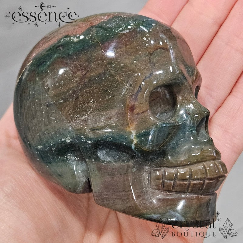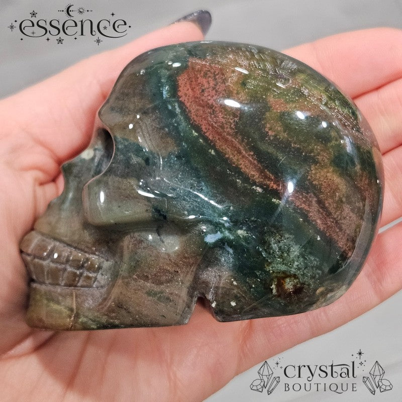 Say hello to this bold and beautiful Ocean Jasper Skull, a dazzling fusion of earthy greens, fiery reds, and smoky undertones. If Mother Nature ever painted a storm, it might look like this – a dramatic, swirling blend of energy frozen in stone!