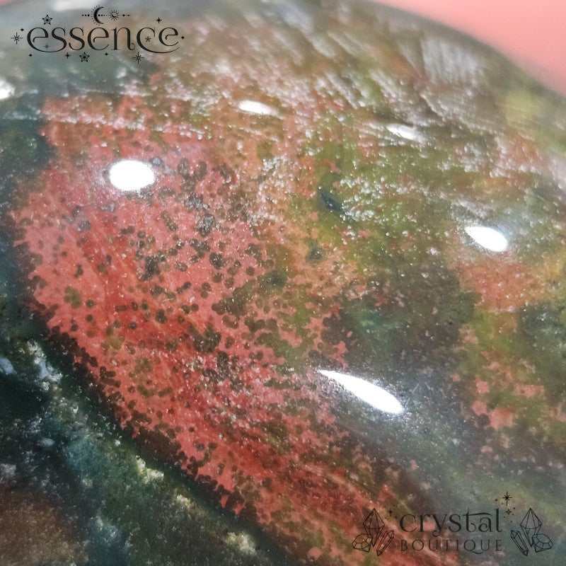 This piece is a jaw-dropper (pun absolutely intended)! On one side, deep forest greens melt into earthy browns and golden bronze tones. On the other, vibrant volcanic reds ripple across the surface in waves, speckled like a secret code from the Earth’s core. Polished to a mirror-like shine, the colours shift with every turn – making it a total joy to gaze at (and hard to put down).