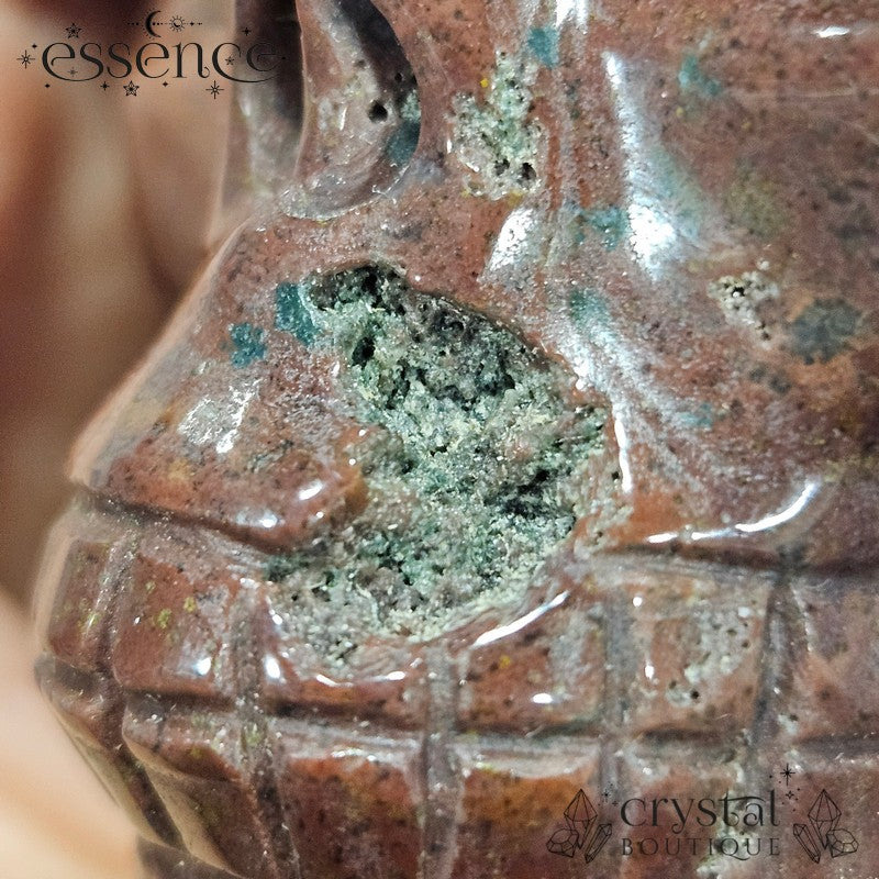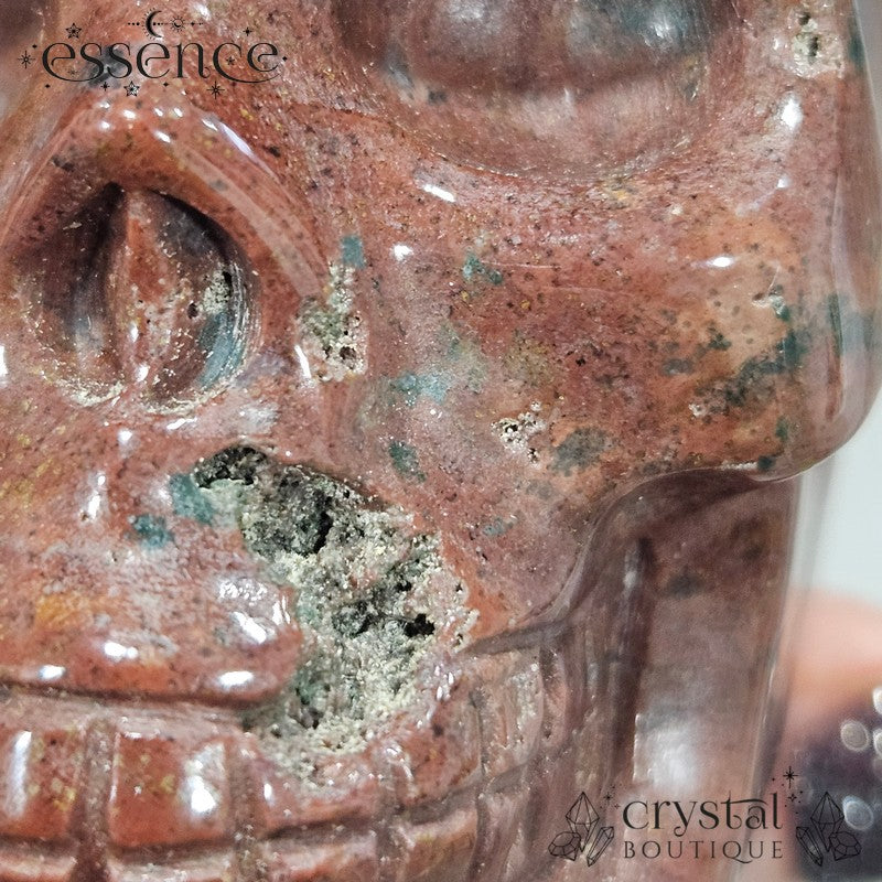 This striking skull is drenched in crimson, russet, and burgundy hues, with subtle patches of forest green, burnt orange, and a scattering of golden flecks throughout. A natural druzy pocket adds an eye-catching sparkle right in the cheek – like a little secret crystal cave revealed mid-carve.