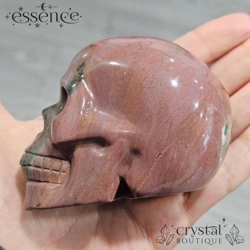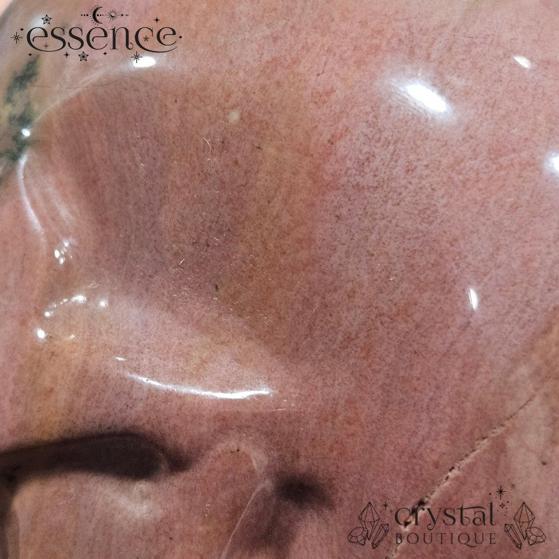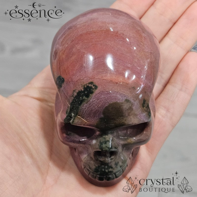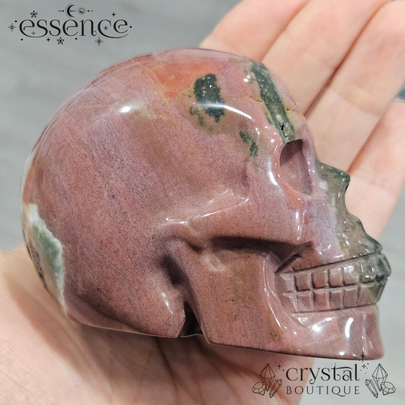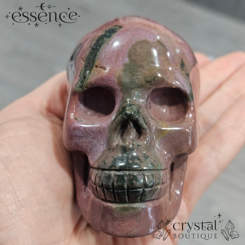 This dreamy Ocean Jasper skull has the kind of soft greens, blushy pinks, and gentle mauves that make you think, “Did this come from a wizard’s garden?” With flowing colours and a chill, nature-loving vibe, Mossveil is basically a wise forest grandma in crystal form. She probably makes great tea.