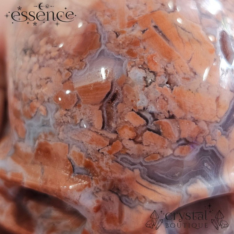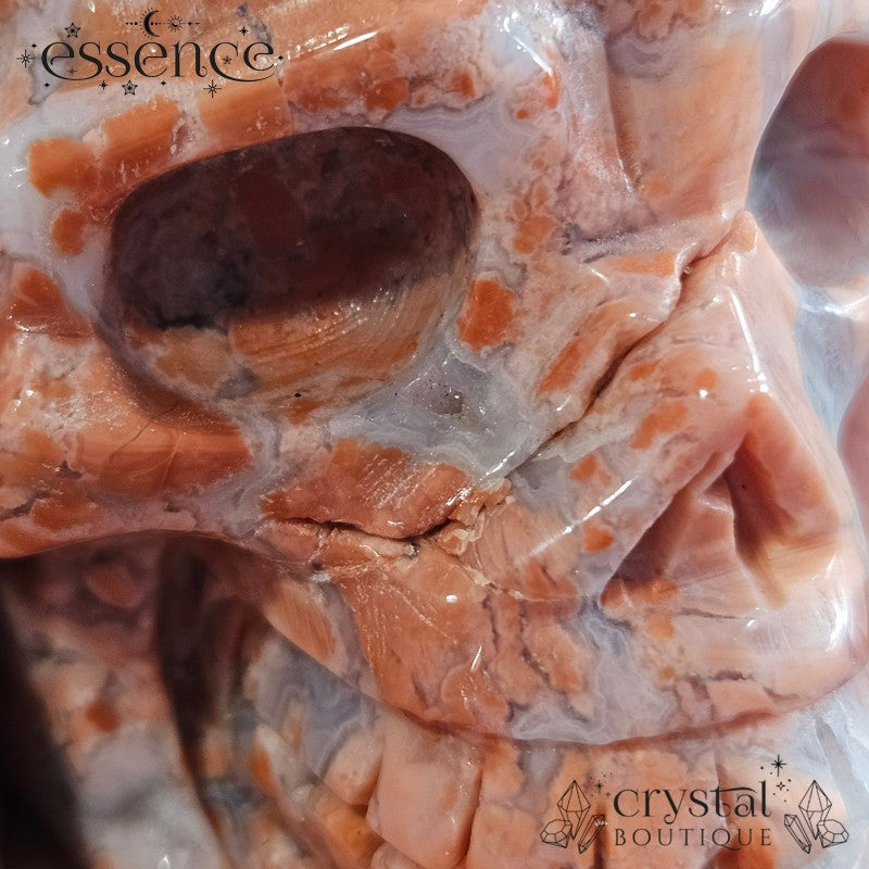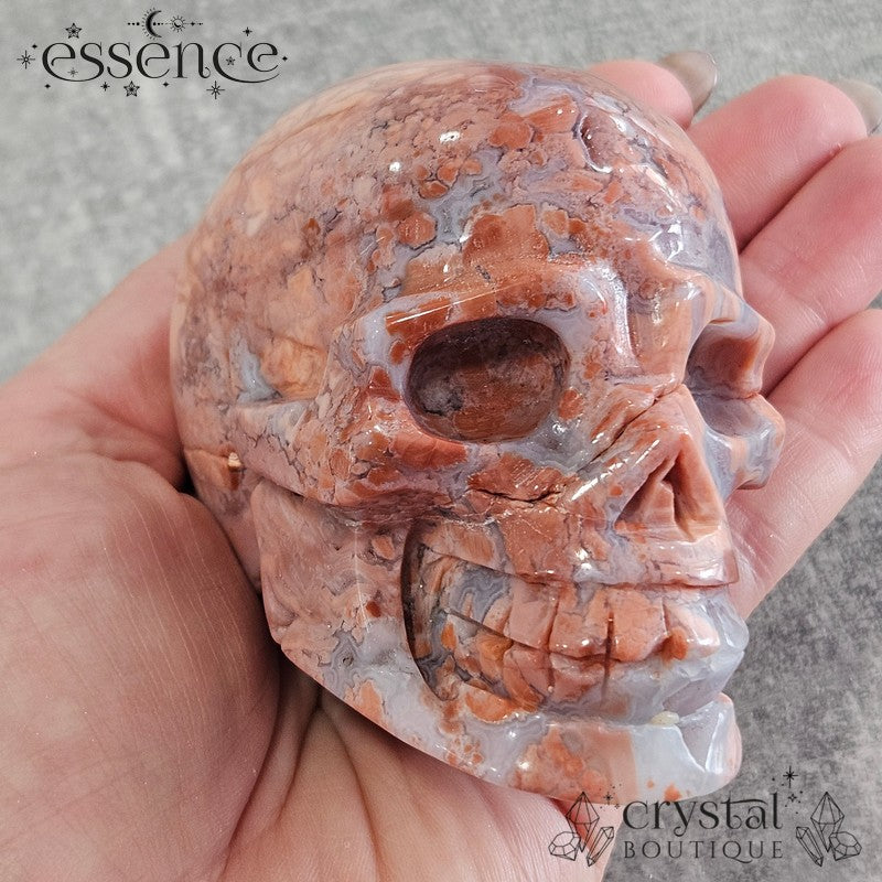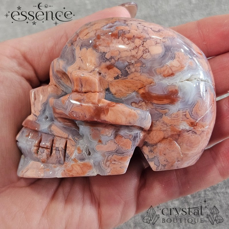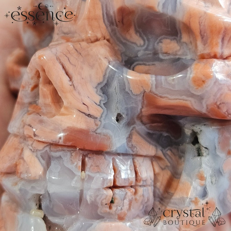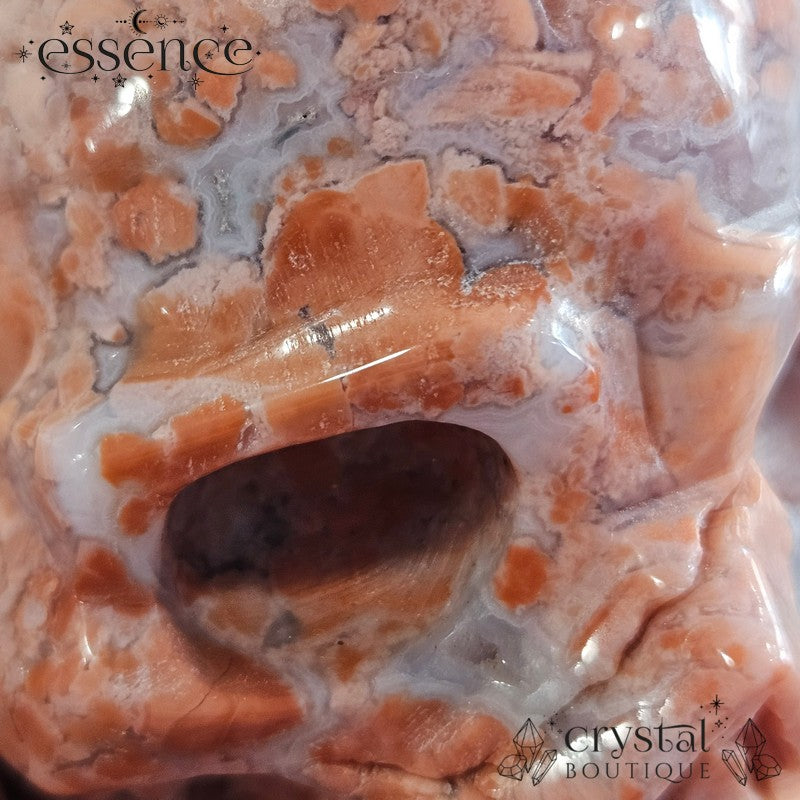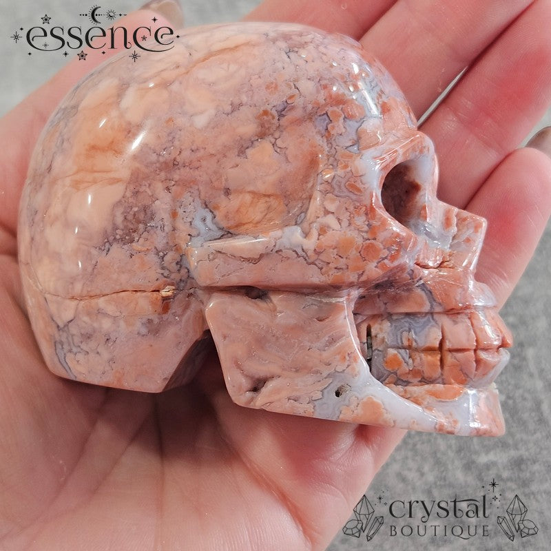 Pink Agate is often associated with gentle grounding, emotional healing, and nurturing energy. It’s said to bring comfort in times of stress and help balance the heart and mind. Whether you’re a crystal collector, a skull enthusiast, or simply drawn to its calming beauty, this piece is as uplifting as it is striking.