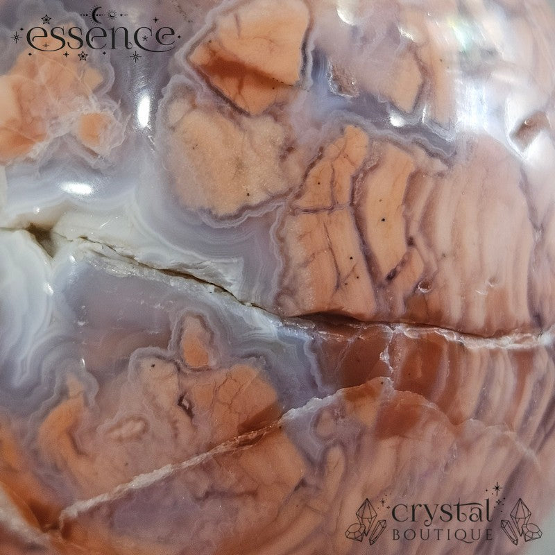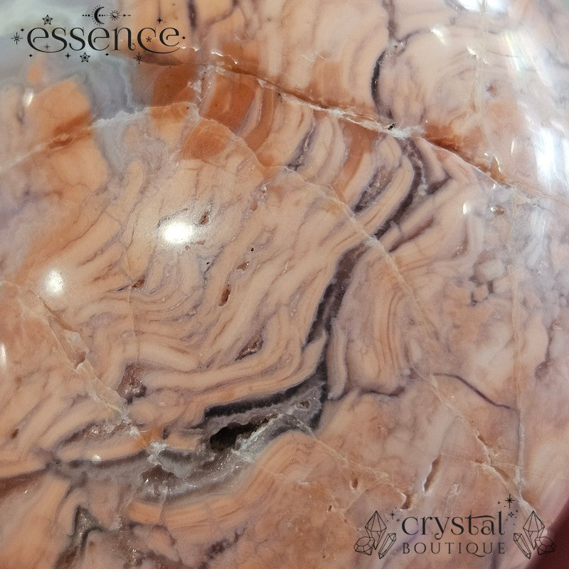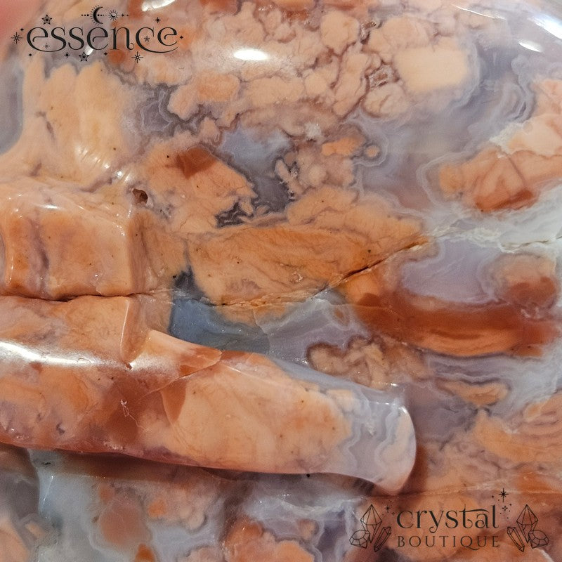 This piece is carved from natural Pink Agate, a variety of chalcedony formed from layers of microscopic quartz crystals. The soft blush tones come from trace minerals, while the creamy whites and lilacs are created as silica-rich fluids slowly filled ancient rock cavities over geological time.