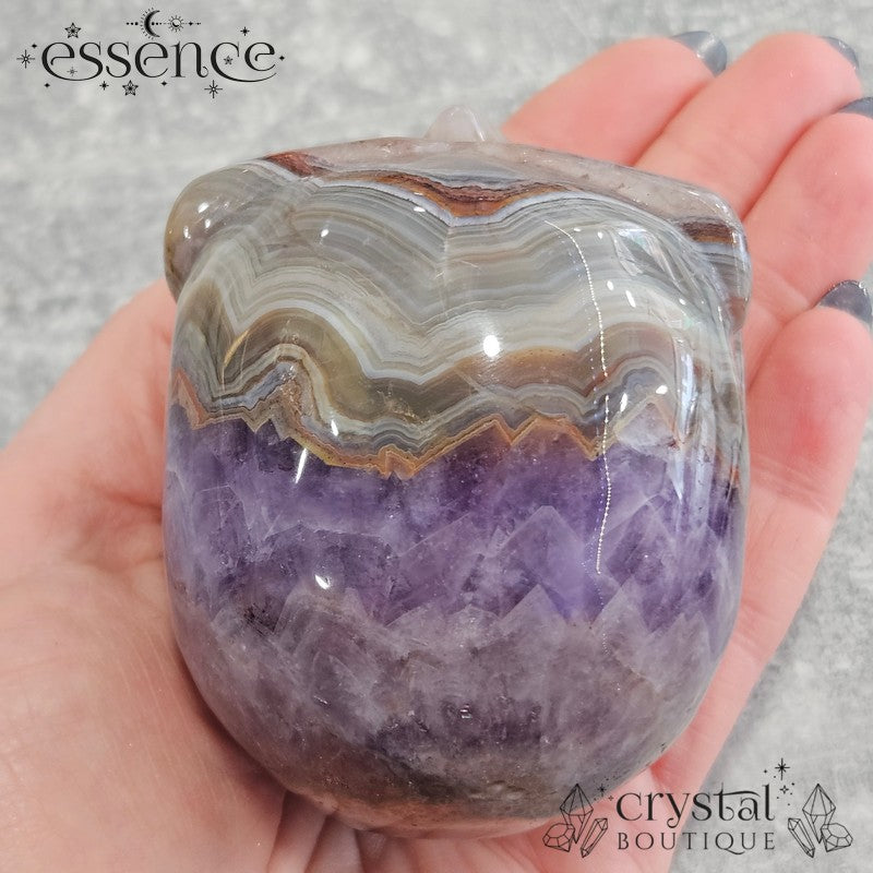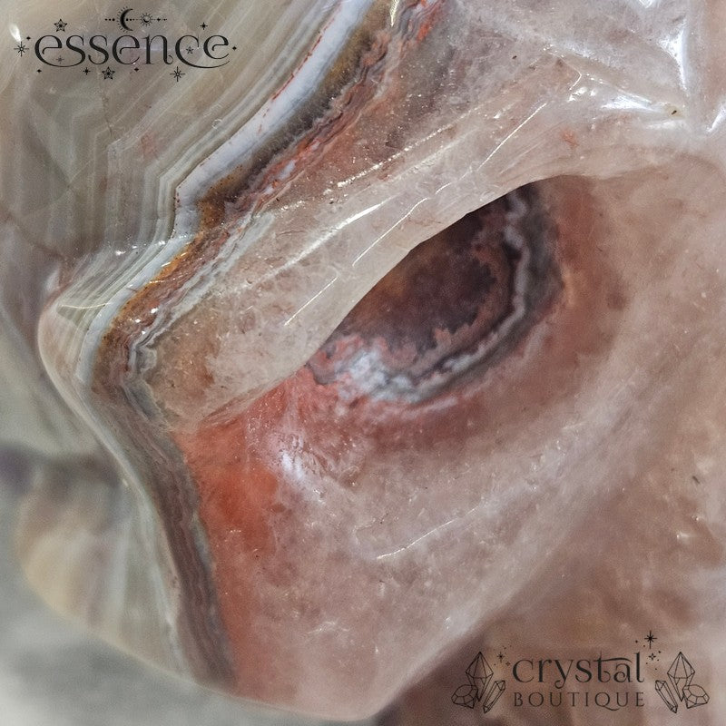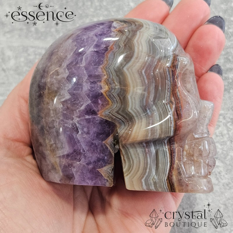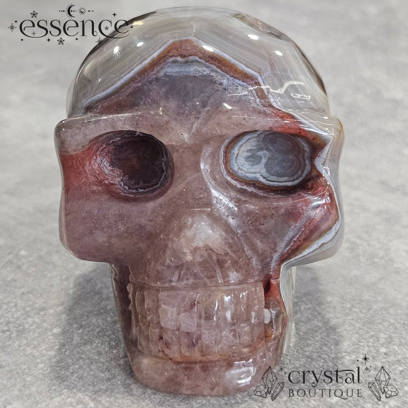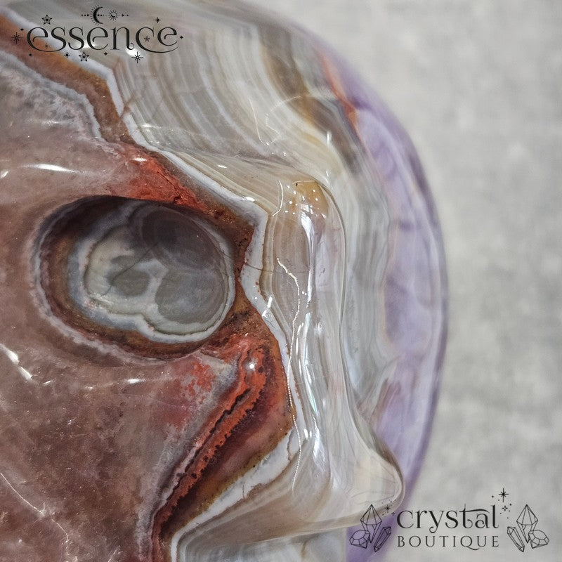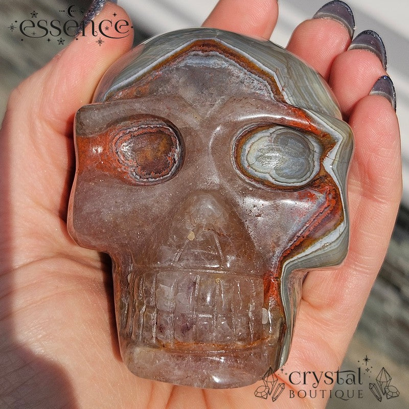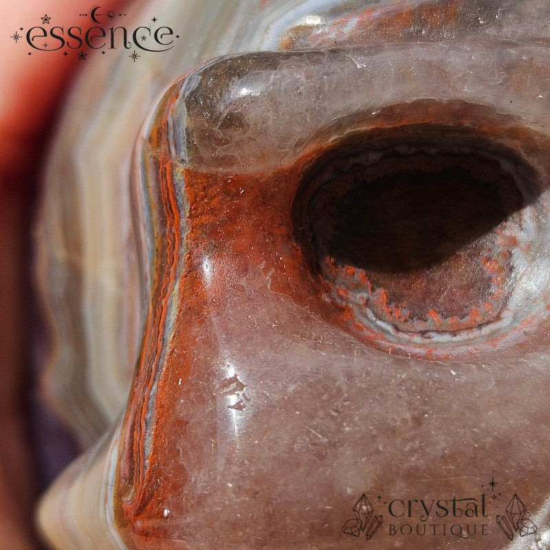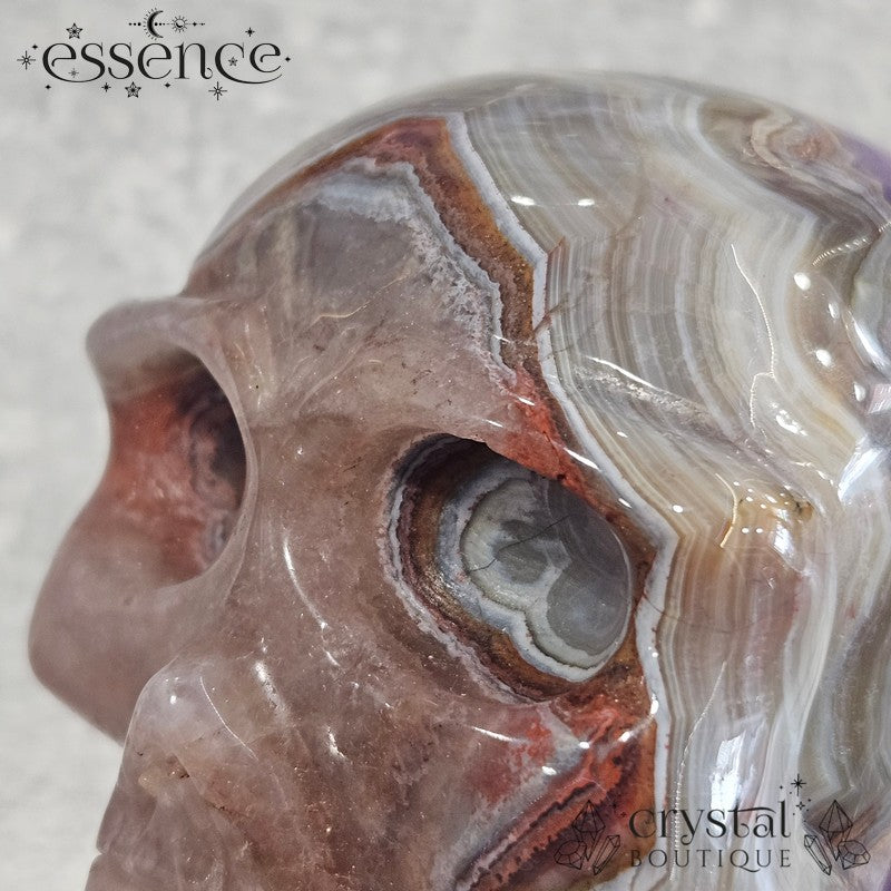 This striking crystal skull is a journey in stone โ beginning with a bold Red Quartz face, flowing into swirling Crazy Lace Agate, and finishing with dreamy Amethyst accented by another pop of Red Quartz at the back. A sculptural stunner that captures the essence of Earthโs natural artistry.
